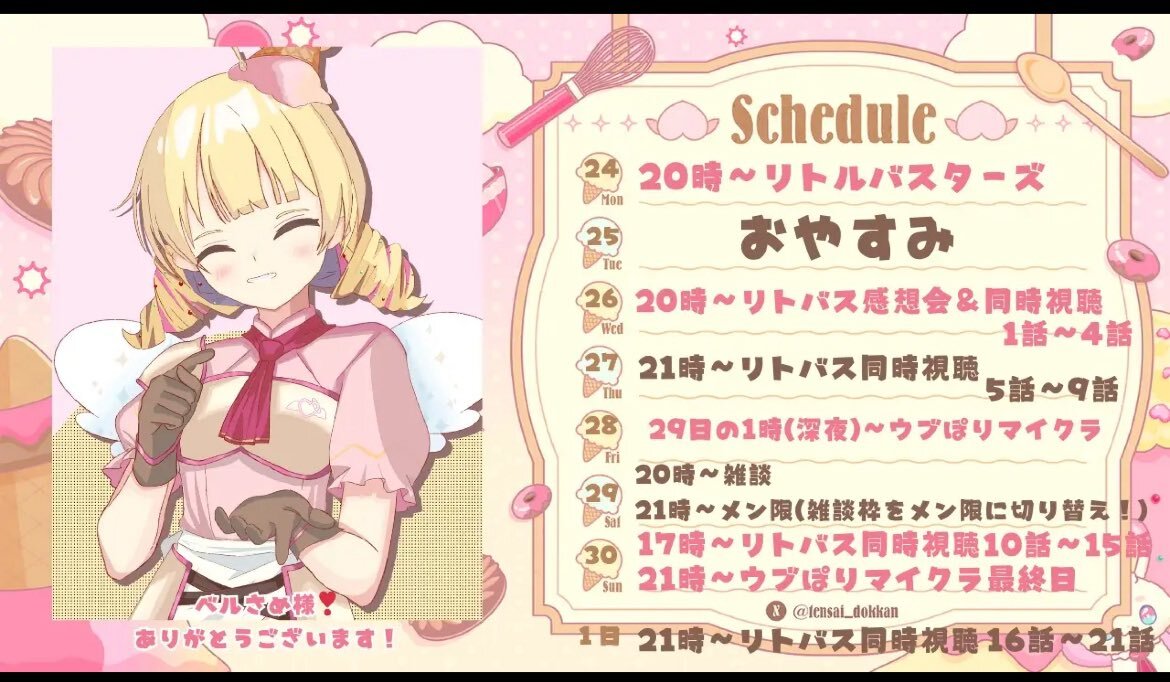 11月30日 #ぶいのこスケジュール 今月ラストの日は 17時 #天彩たたん アニメ同時視聴「リトルバスターズ」 21時 天彩たたん コラボゲーム「ウブほりマイクラ」 21時 #月歌ぐりむ 歌枠 21時30分 #雪鈴ましろ 内容未定 の配信予定、みんなで楽しく過ごしましょう。