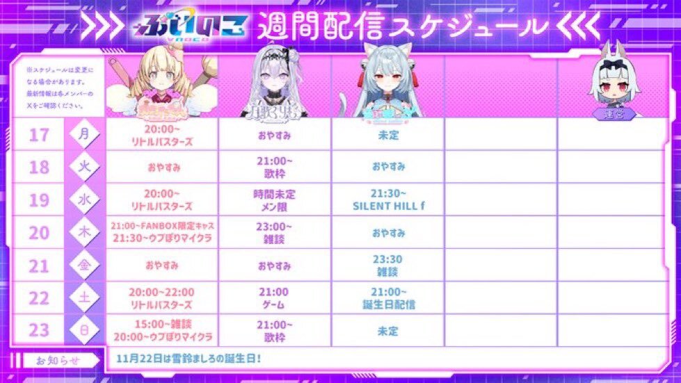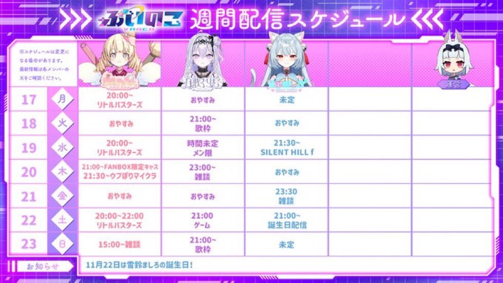 11月21日 #ぶいのこスケジュール 23時30分 #雪鈴ましろ 誕生日カウントダウン配信 のみとなります。 #天彩たたん#月歌ぐりむ は配信お休みです。 是非ともその瞬間を共に見ませんか pic.x.com/LuMJ3jXWMD