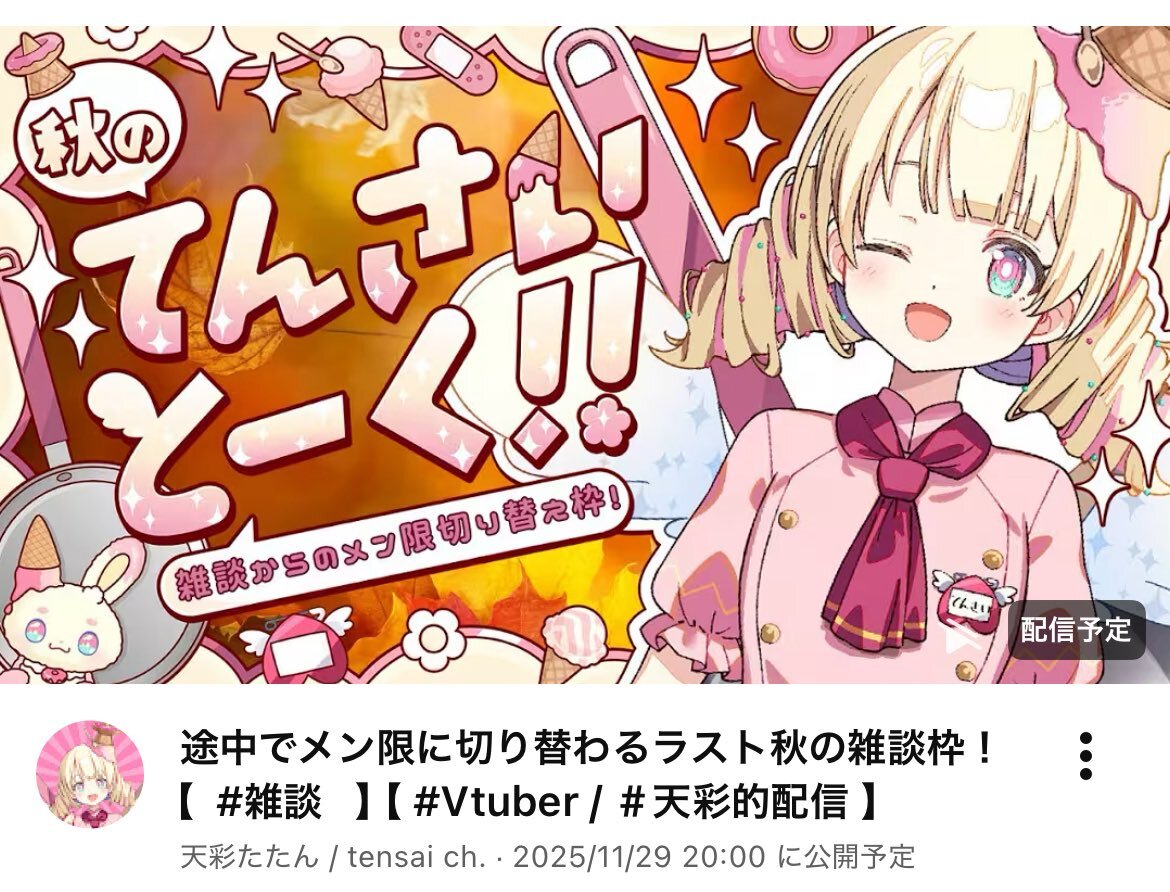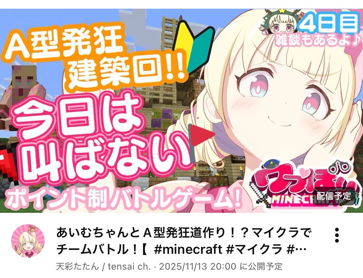 11月20日 #ぶいのこスケジュール 21時 #天彩たたん ファンボ特典配信 21時30分 天彩たたん ゲーム配信「ウブほりマイクラ」 23時 #月歌ぐりむ 雑談 #雪鈴ましろ は配信お休みです。 今日も楽しく過ごしましょう。