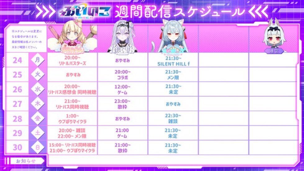 11月24日 #ぶいのこスケジュール 20時 #天彩たたん ゲーム配信「リトルバスターズ」 #月歌ぐりむ#雪鈴ましろ は連絡待ちとなっております。 本日もゆっくりすごしながら、配信やアーカイブを楽しみましょう。