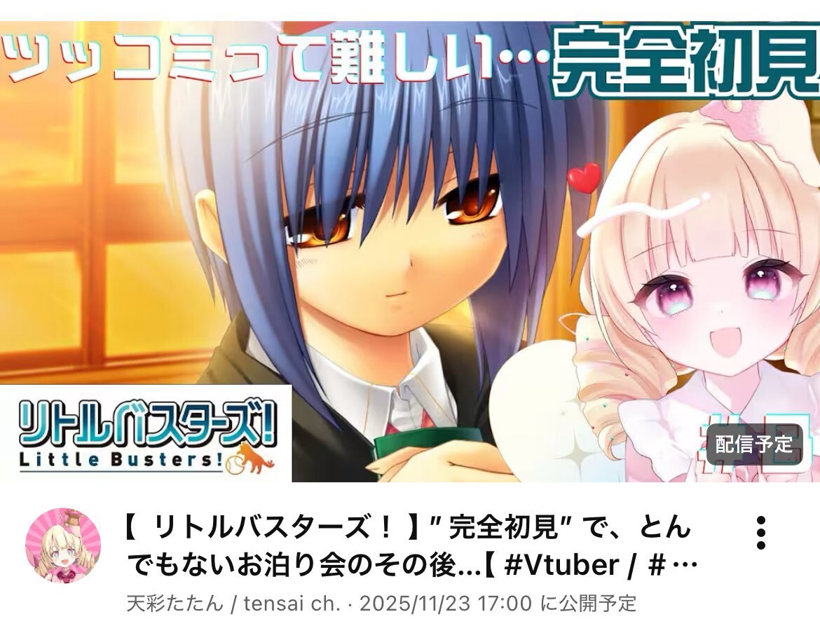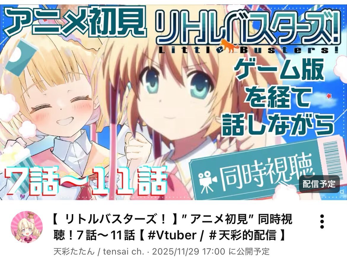 11月27日 #ぶいのこスケジュール 21時 #天彩たたん アニメ同時視聴「リトルバスターズ」 23時 #月歌ぐりむ 歌枠 #雪鈴ましろ は配信おやすみ の予定となっております。 本日も配信やアーカイブを楽しみましょう