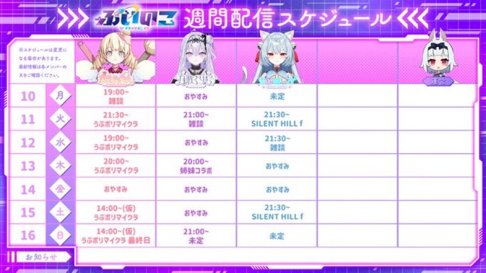 11月16日 #ぶいのこスケジュール 21時 #天彩たたん コラボマイクラ「ウブぽり最終日」 21時 #月歌ぐりむ ゲーム配信 #雪鈴ましろ は体調次第での配信、連絡待ち となっております。 本日も楽しく過ごしましょう。 pic.x.com/l3QAjsth3G