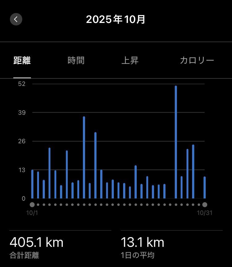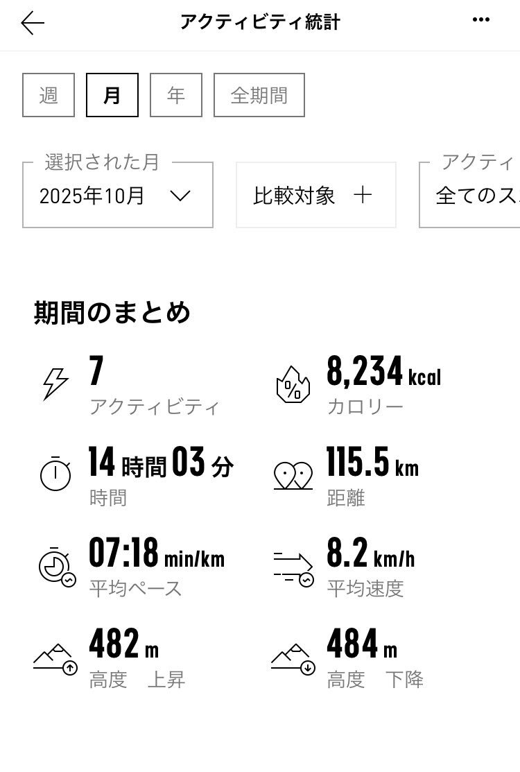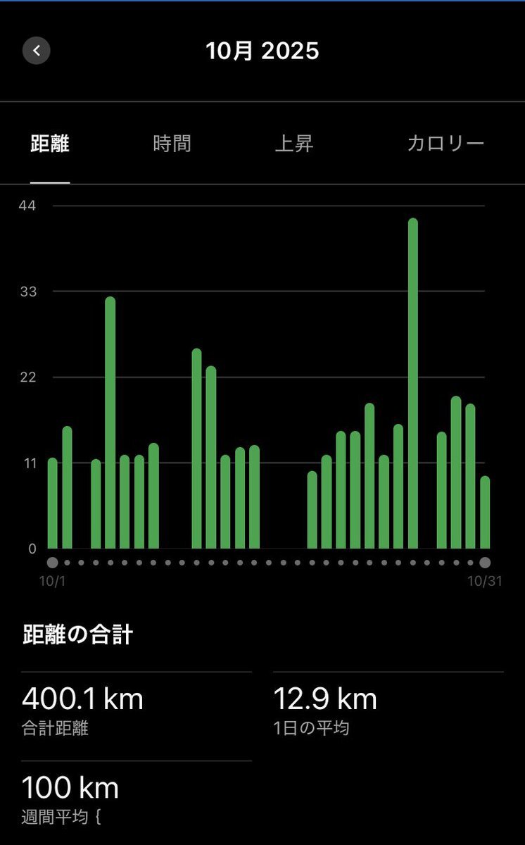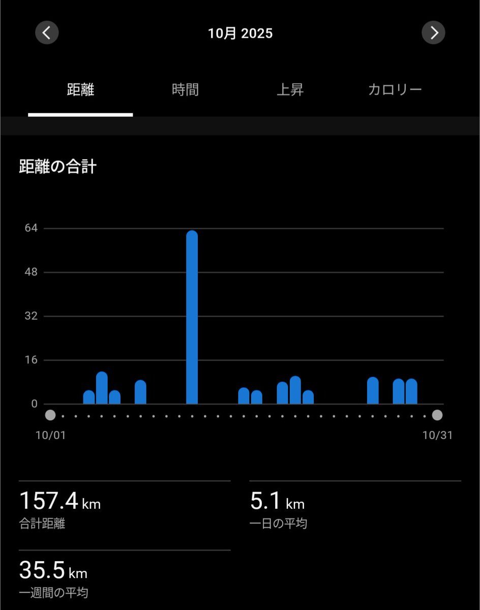 10月の月間走行距離は、157.4km 3ヶ月連続の200km超え成らず ハセツネ後に休みすぎたか そのハセツネ含め直近2回連続 トレランレースでは目標未達 次のレースは久しぶりのロード10k 1秒でもPB更新するぞー 11月弾みをつけて12月のレースに繋げたい! #月間走行距離 #ランニング pic.x.com/9aSKrVWnVk