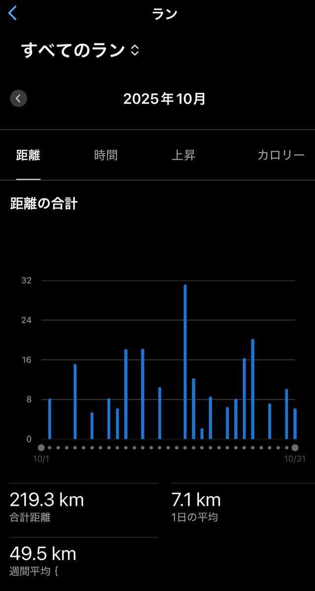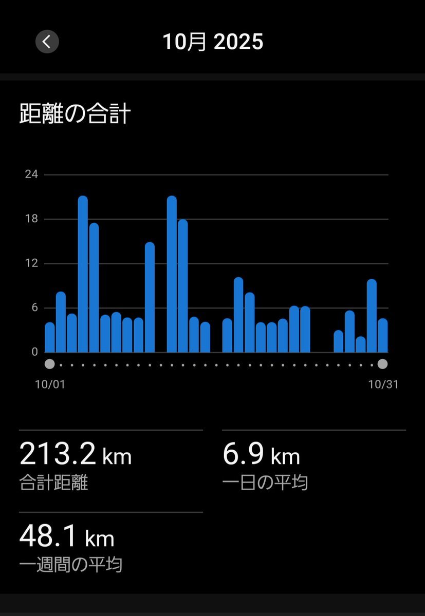 #月間走行距離 #犬の散歩 10月の月間走行距離は250km目標に対して219kmでした😅 平日距離を走れてないのが目標未達の原因です!休日にロング走で足にダメージ有りの筋力不足と気持ちの問題かと思われます。 ただ200kmは超えたのでヨシ!とします😅 pic.x.com/FM4OLo7HCu
