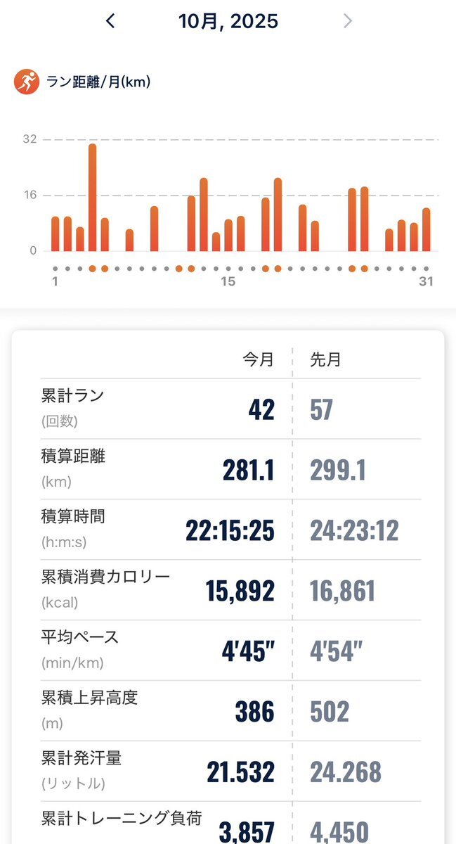 10月:304.9km レース:東京レガシー(H)1:56:28 水戸(F)3:57:28 オフ日多くてギリで300k乗せ 月を通して全く調子上がっている実感なかったが、2つのレースはまずまずまとめられた 9月以降の経緯からすれば、今はこんなものか 今月から出直しのつもりでまた頑張ります #ラン記録 #月間走行距離 pic.x.com/0Tachay8UN