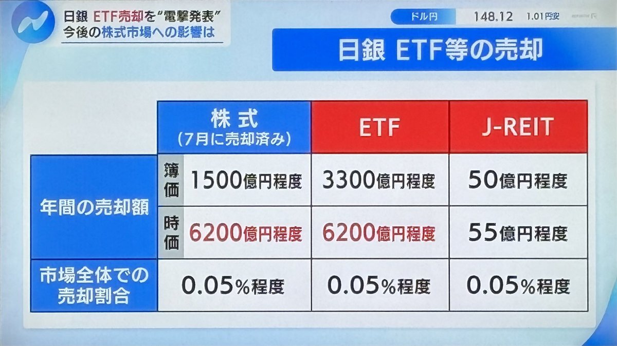 日銀の金融資産(株式・ETF・J-REIT)の年間売却額です。株式(銀行株)は処分済みですが、#ETF とJ-REITは今後も市場への影響を最小限にしながら緩やかに売却し続ける模様。日銀はETFを簿価で37兆円保有している事から年3300億円売却しても単純計算で、37÷0.33≒112年45日かかりますね。 #有価証券 #日銀 pic.x.com/Mp1jkWGynj