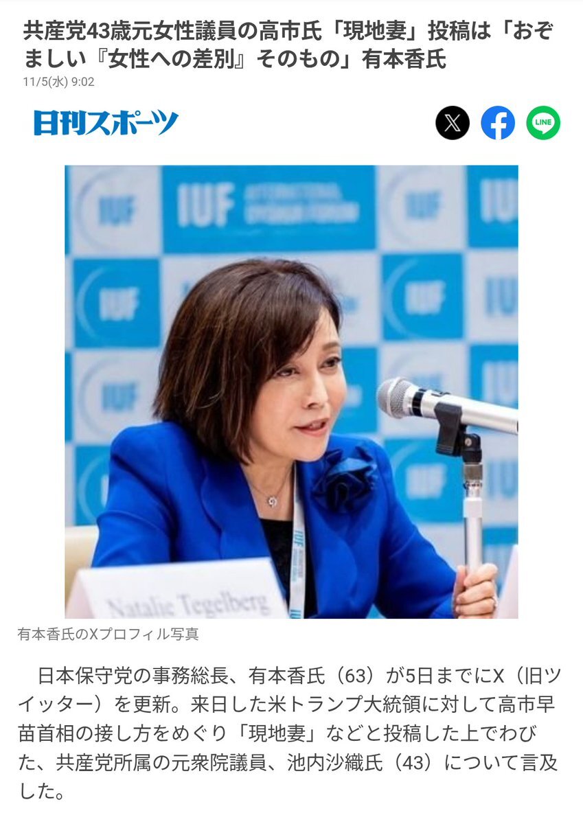 #日本保守党 #有本香事務総長 ◇共産党元女性議員の高市氏巡る「現地妻」投稿は「おぞましい『女性への差別』そのもの」有本香氏 - 政治 : 日刊スポーツ nikkansports.com/general/nikkan…