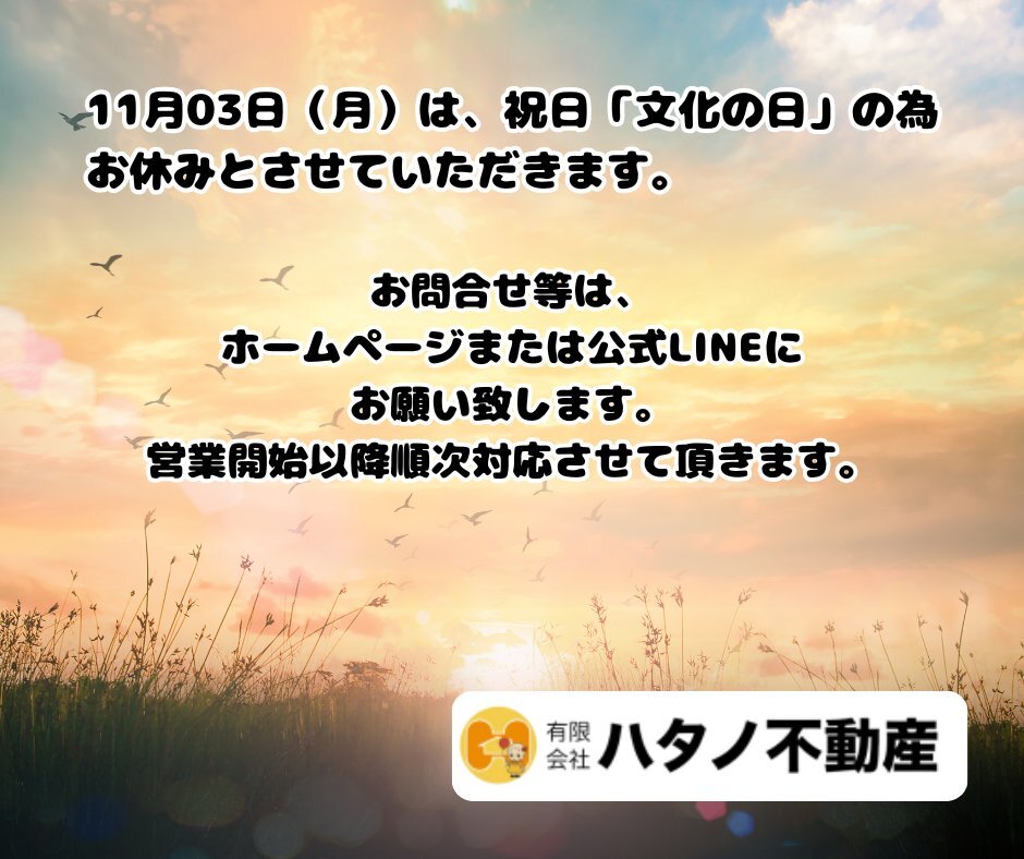 おはようございます、スタッフYです。 本日、11月03日は祝日「文化の日」の為、お休みとさせて頂きます。 頂いたお問合せ等は、11月04日以降順次対応致します。 ご迷惑をおかけいたしますが宜しくお願い致します。 ▼最新の物件情報はこちら▼ hatano-f.net #有限会社ハタノ不動産 pic.x.com/uQ6LVlpb16