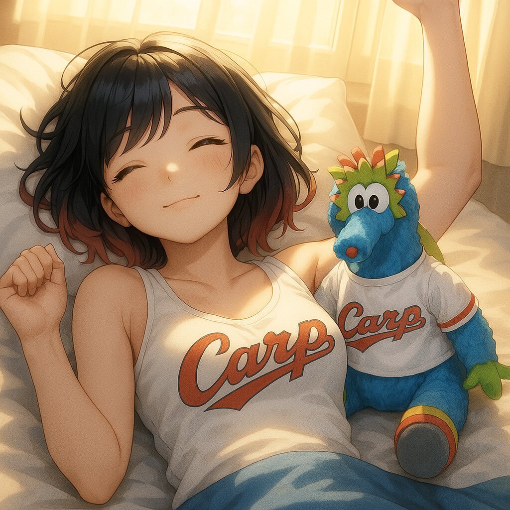 おはよう☀ お気に入りのぬいぐるみと、ちょっとだけ遅めの朝。 今日もマイペースで、いい日にしようね。 #朝のひと言 #ゆるっと朝時間 #カープ女子 #ぬいぐるみと一緒 #AIイラスト pic.x.com/3ptLVCmNuO