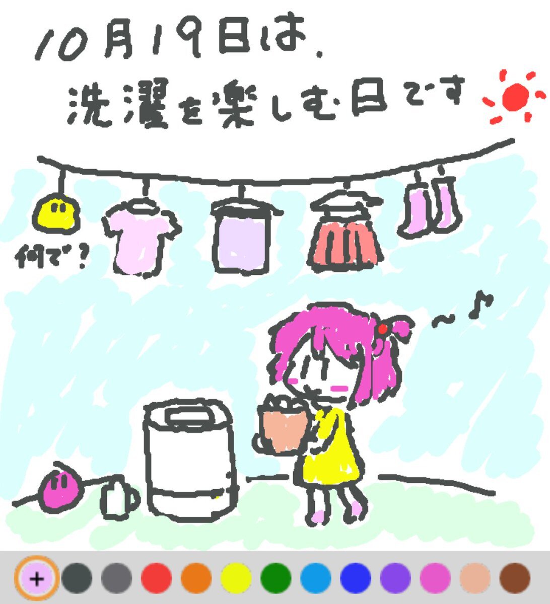 10月19日は、 洗濯を楽しむ日でした♪ 日付は、10月19日を「1019」として「せん(1000)とく(19)=たく」(洗濯)と読む語呂合わせから♪ 「秋晴れ」のこの季節、「洗濯・乾燥」を楽しめる日にしたいですね(#^.^#) #REALITYで描いてみた #REALITYイラスト部 #朝の10分お絵描き #今日は何の日 pic.x.com/jBIGctogqk