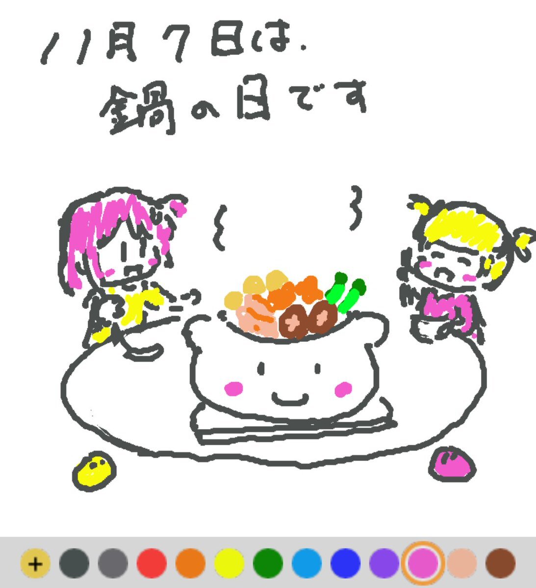 11月7日は 鍋の日でした♪ 日付は、この日が立冬になることが多く、冬の到来を感じる頃になることから♪ 冬に向かい鍋物が美味しくなり、家族で鍋を囲んで団らんを楽しんでもらおうとの願いが込められています(#^.^#) #REALITYで描いてみた #REALITYイラスト部 #朝の10分お絵描き #今日は何の日 pic.x.com/nHJ1FGF28g