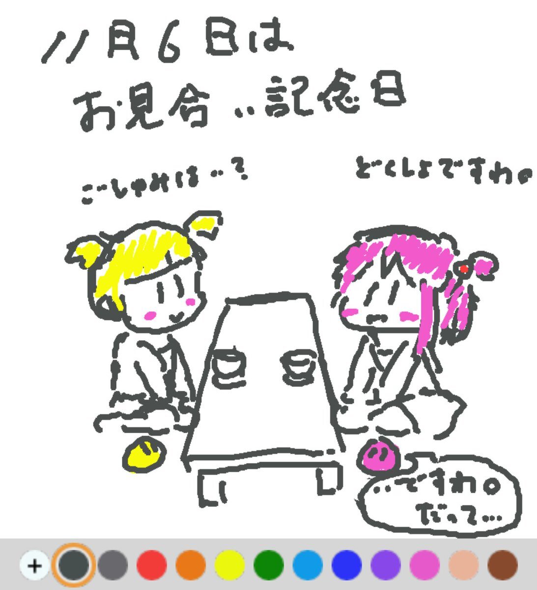 11月6日は、 お見合い記念日でした♪ 日付は、1947年のこの日、東京の多摩川河畔で集団お見合いが開催されたことから♪ 当時は戦争の影響で、出会うきっかけを逃した人が多かったという事情があったようです(#^.^#) #REALITYで描いてみた #REALITYイラスト部 #朝の10分お絵描き #今日は何の日 pic.x.com/uCvehI93r5