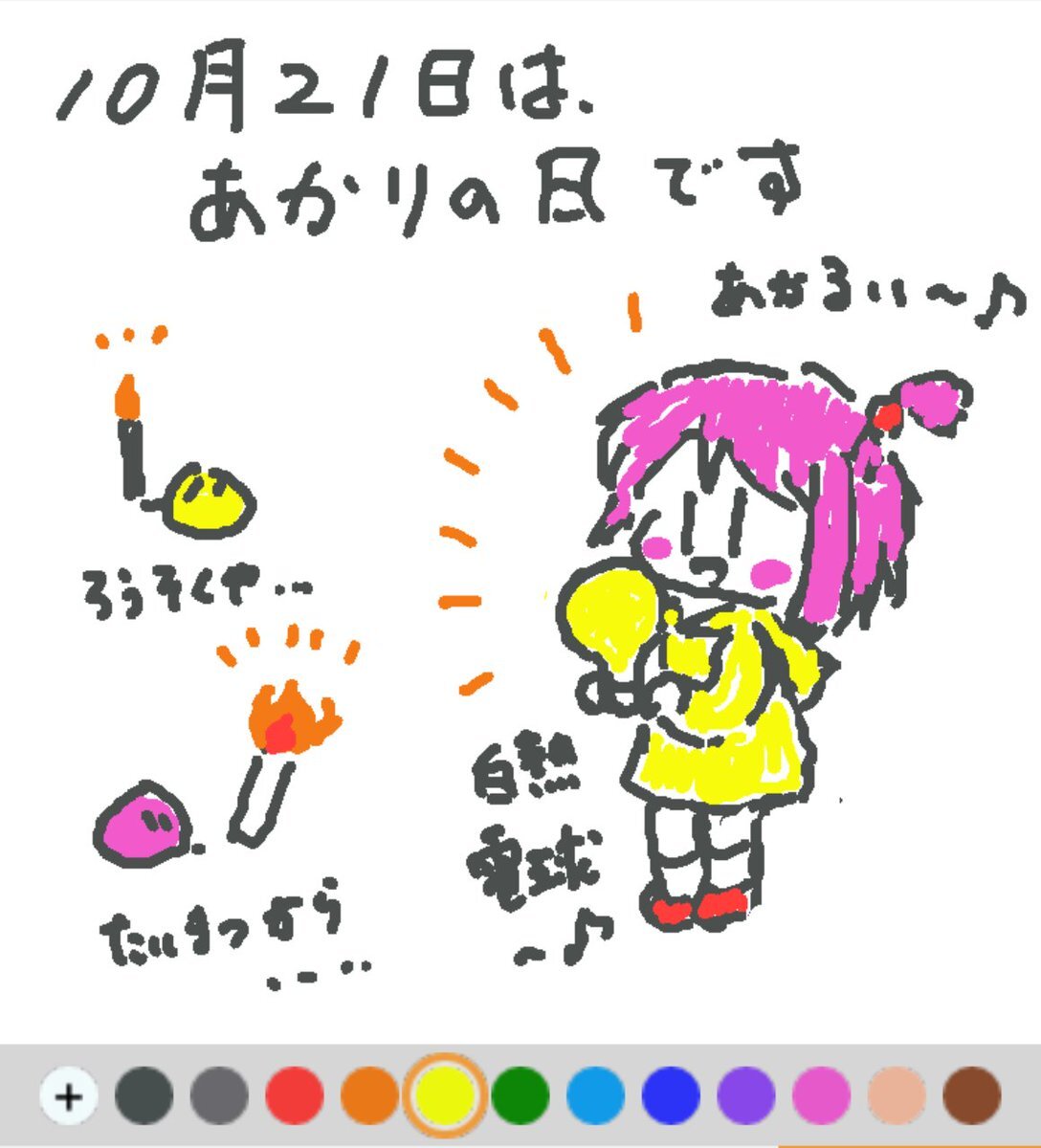 10月21日は、 あかりの日でした♪ 日付は、1879年のこの日、エジソンが世界で初めて実用的な白熱電球を完成させたことから♪ その後エジソンが、電球のフィラメントに京都の竹を使ったというのは有名な話ですね(#^.^#) #REALITYで描いてみた #REALITYイラスト部 #朝の10分お絵描き #今日は何の日 pic.x.com/ubhLPJhYxG
