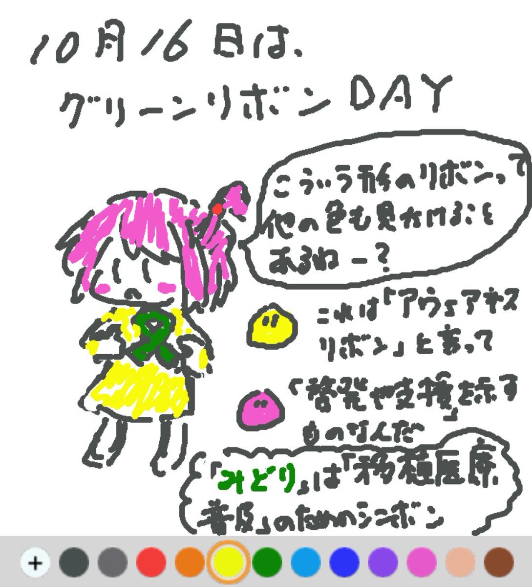 10月16日は、 グリーンリボンDAYでした♪ 啓発活動や支援の意志を示すために身に付けるリボン、「アウェアネスリボン」。 グリーンは、臓器移植への正しい理解とドナーとドナーの家族への敬意を表しています(#^.^#) #REALITYで描いてみた #REALITYイラスト部 #朝の10分お絵描き #今日は何の日 pic.x.com/kNBDLQNjZ5
