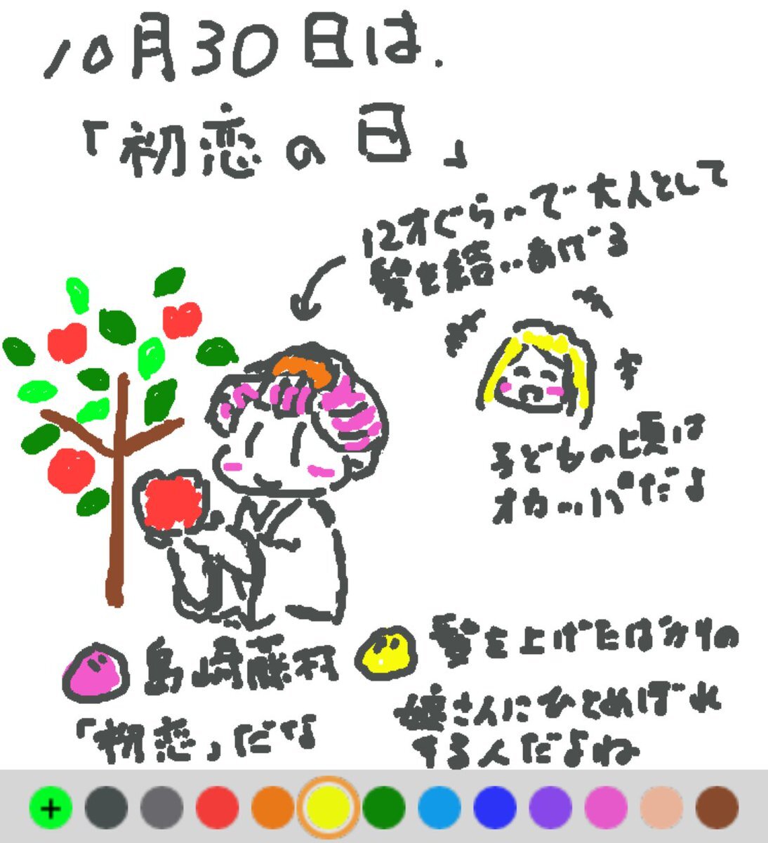 10月30日は、 初恋の日でした♪ 日付は、1896年のこの日、島崎藤村が「初恋」の詩を発表したことから♪ りんご畑で前髪をあげたばかりの少女に出会い、恋が始まる。 初恋とりんご。どこか共通する気がします(#^.^#) #REALITYで描いてみた #REALITYイラスト部 #朝の10分お絵描き #今日は何の日 pic.x.com/Pe0X3mf0dr