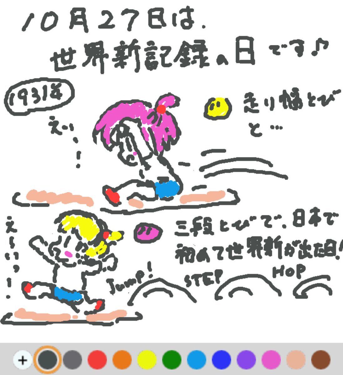 10月27日は、 世界新記録の日でした♪ 日付は、1931年のこの日、神宮競技場で行われた第6回明治神宮体育大会で、日本初の世界新記録が走り幅跳び7.98m(現8.95m)と三段跳び15.58m(現18.29m)で記録されたことから(#^.^#) #REALITYで描いてみた #REALITYイラスト部 #朝の10分お絵描き #今日は何の日 pic.x.com/u5tCnCUBfV