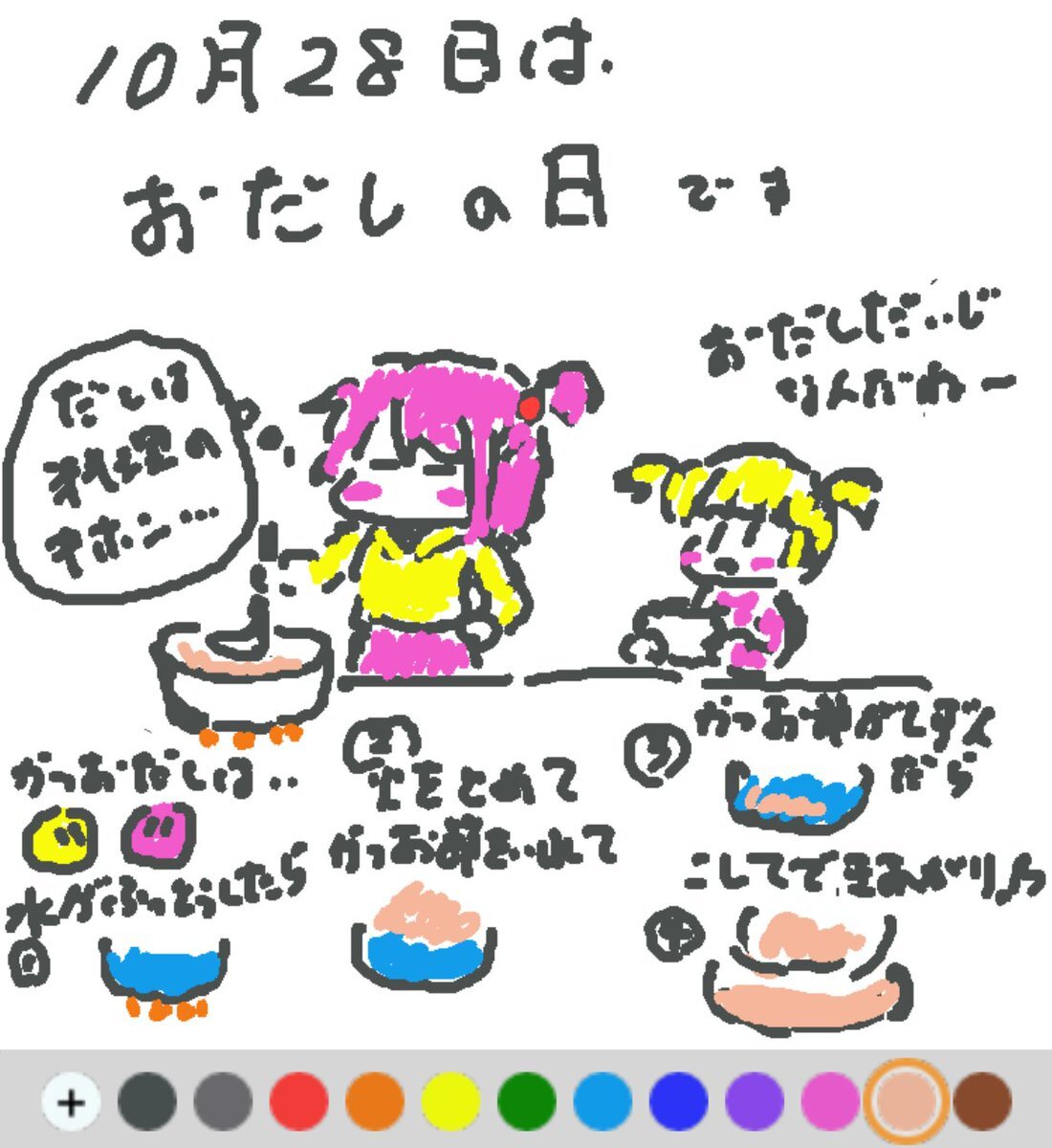 10月28日は、 おだしの日でした♪ 料理に主にうま味を加えるために用いられるおだし♪ 鰹節、昆布、煮干し、椎茸、野菜、魚のアラなど様々なだしがあり、「味の基礎」となっています(#^.^#) #REALITYで描いてみた #REALITYイラスト部 #朝の10分お絵描き #今日は何の日 pic.x.com/eshcu0VG5d