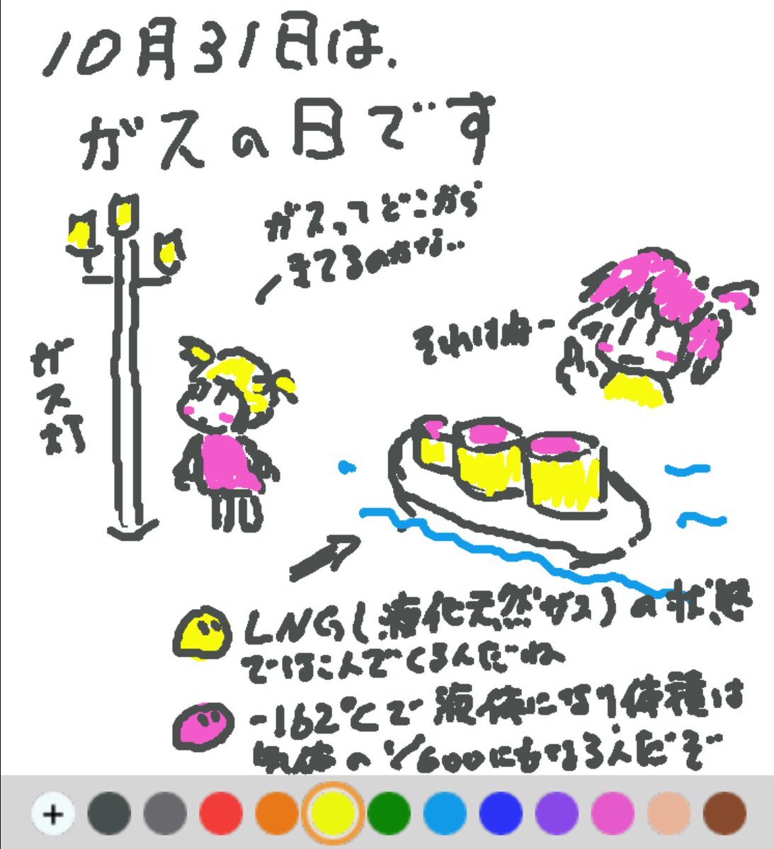 10月31日は、 ガス記念日でした♪ 日付は、1872年のこの日、横浜の馬車道において日本で初めてガス灯が点灯されたことから♪ 天然ガスは、ー162℃で液化すると体積が600分の1になって運びやすくなるそうです(#^.^#) #REALITYで描いてみた #REALITYイラスト部 #朝の10分お絵描き #今日は何の日 pic.x.com/w1us48RNm0