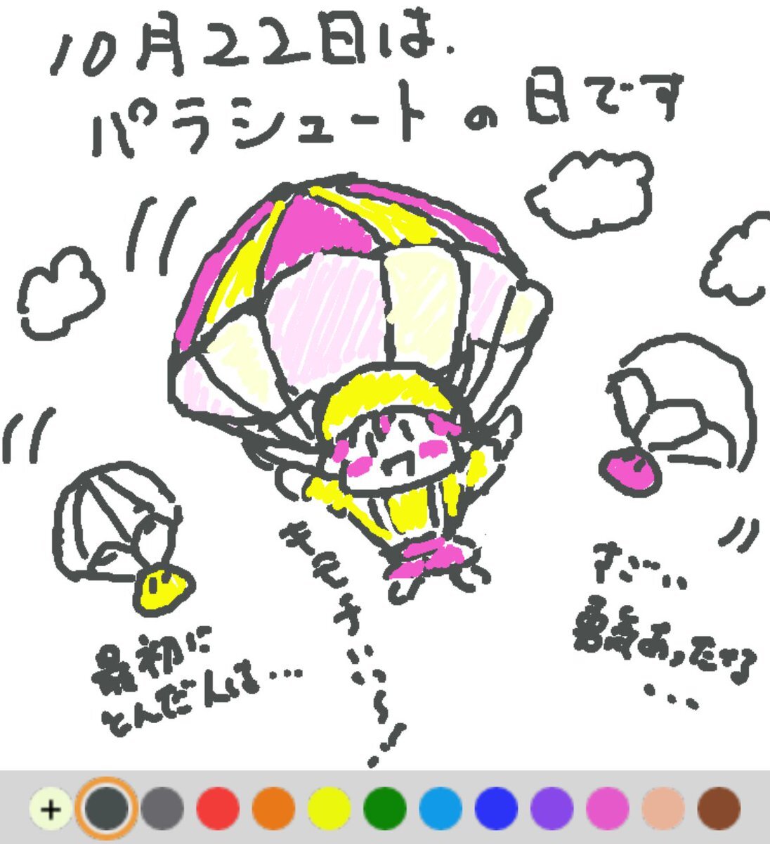 10月22日は、 パラシュートの日でした♪ 日付は、1797年のこの日、フランス人ガルヌランが高度約900mの熱気球から自作パラシュートで飛び降り成功させたことから♪ 初めて飛び降りる時、怖くなかったのですかね(#^.^#) #REALITYで描いてみた #REALITYイラスト部 #朝の10分お絵描き #今日は何の日 pic.x.com/wm6kfIQAsS