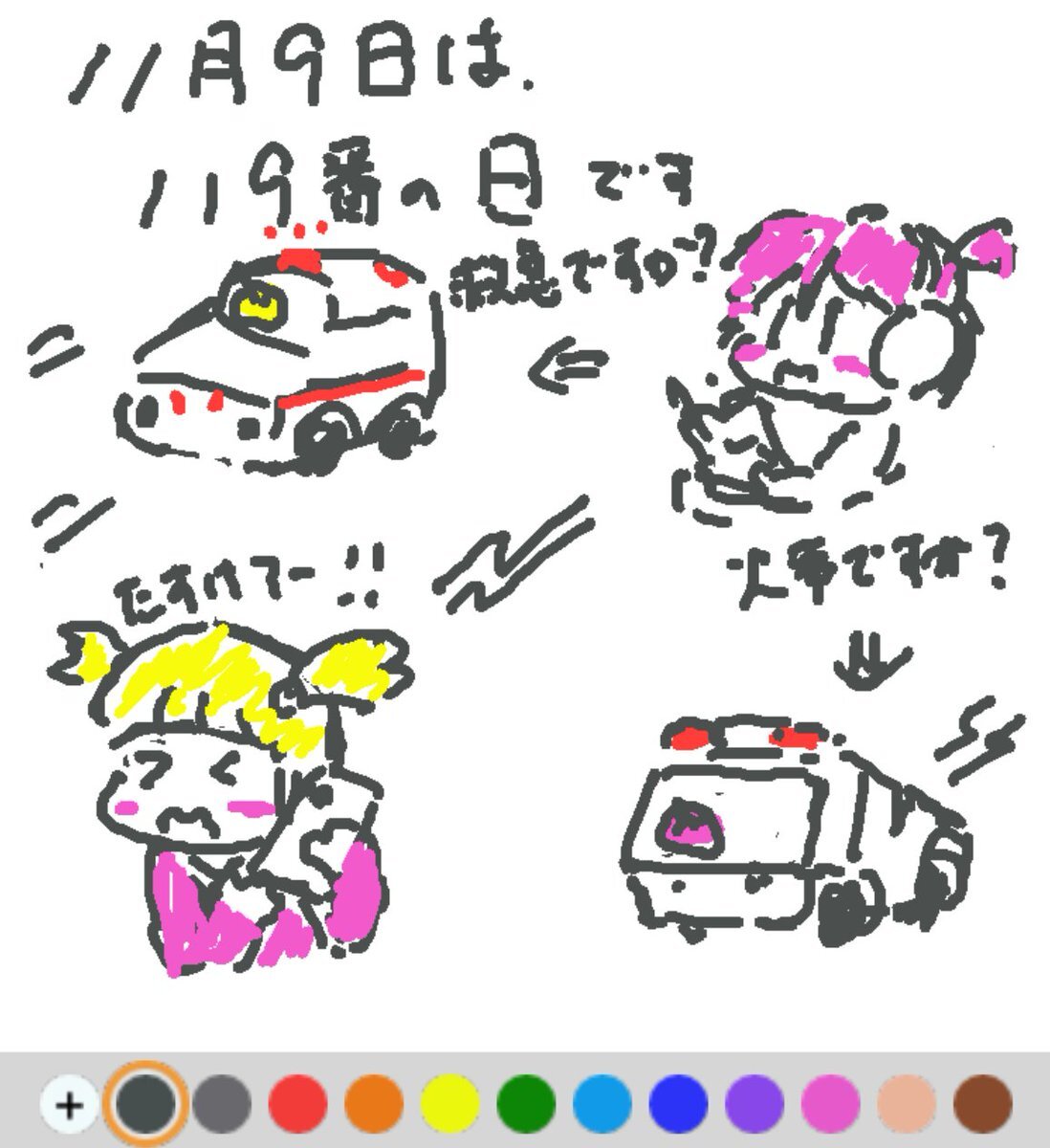 11月9日は、 119番の日でした♪ 日付は、消防機関に提供される緊急通報用電話番号「119番」にちなんで♪ 一刻一秒を争う消火活動や救急・救助活動のため、ほんとに必要な時だけ利用したいですね(#^.^#) #REALITYで描いてみた #REALITYイラスト部 #朝の10分お絵描き #今日は何の日 pic.x.com/BhR597W8SX