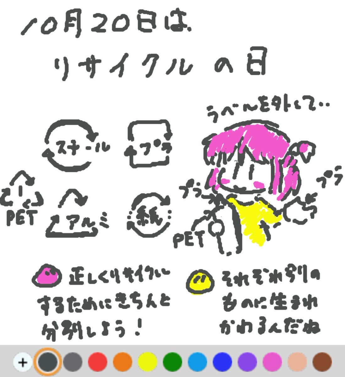 10月20日は、 リサイクルの日でした♪ 循環型社会を目指す取り組み「3R」(リデュース:ごみの発生を減らす、リユース:繰り返し使う、リサイクル:再生して利用する)を意識し、持続可能な社会を目指しましょう(#^.^#) #REALITYで描いてみた #REALITYイラスト部 #朝の10分お絵描き #今日は何の日 pic.x.com/Uh2pRtrHX1