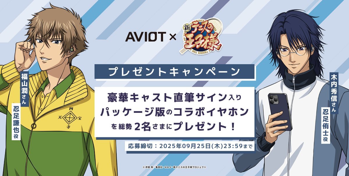 / #AVIOT ×『新テニスの王子様』 豪華キャスト直筆サイン入りパッケージ版のコラボイヤホンを 総勢2名さまにプレゼント🎁 \ コラボイヤホンの発売を記念して、プレゼントキャンペーンを実施❗️ 【応募方法】 #木内秀信さん #福山潤さん