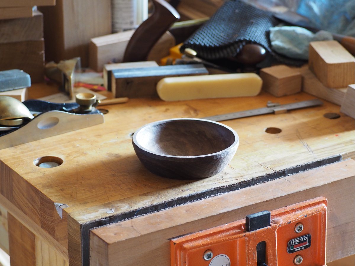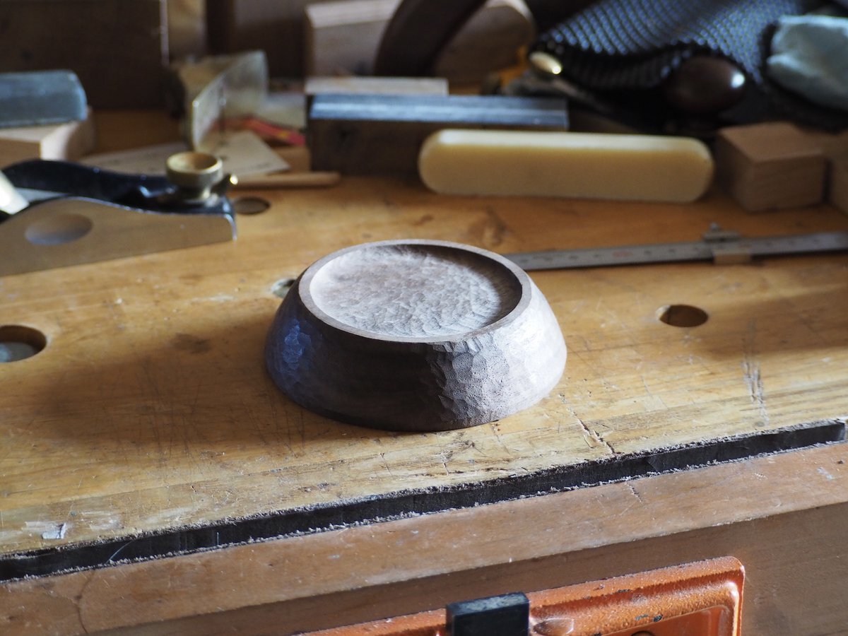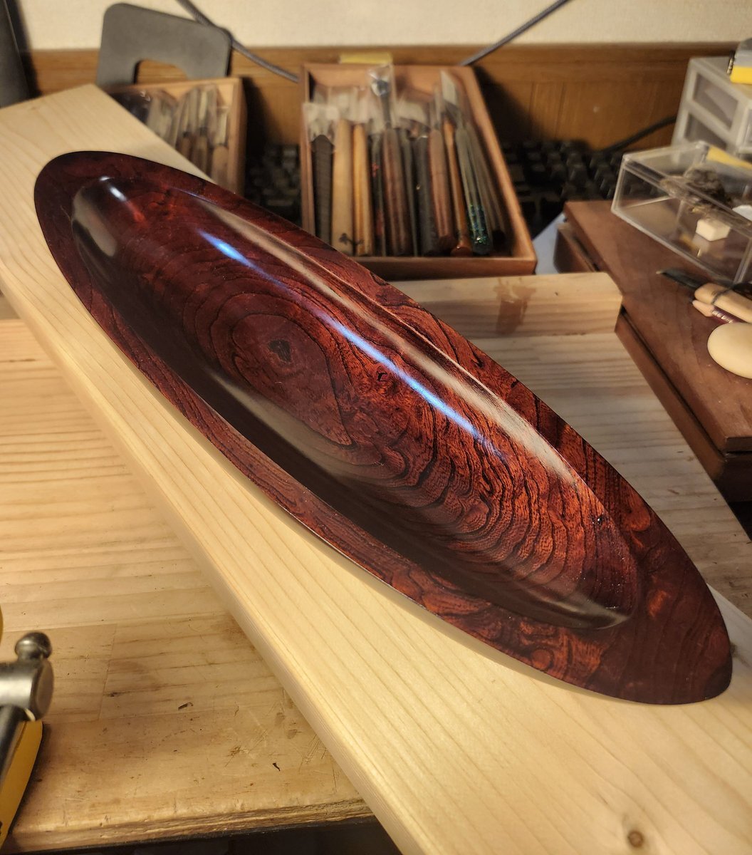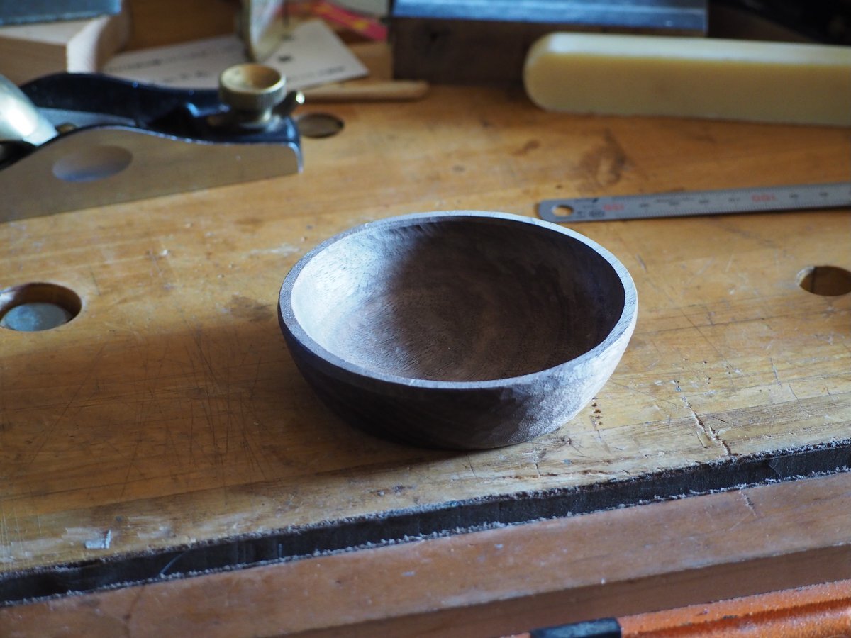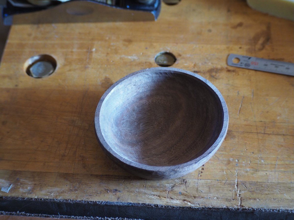ウォルナットの小鉢は(半径109mm)こんな感じにしました。 これにて完成。 ちょっと硬いウォルナット材で、削るのが大変でした。 次は、ブラックチェリーでもう少し幅のあるのを作るので、それと合わせてまとめてオイル塗装します。 #木工 pic.x.com/V8sCNkL5Be