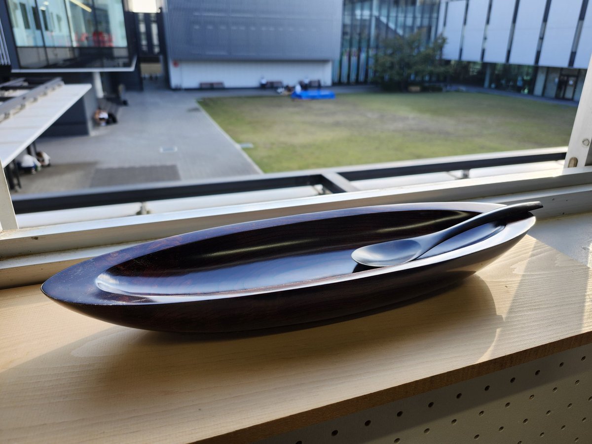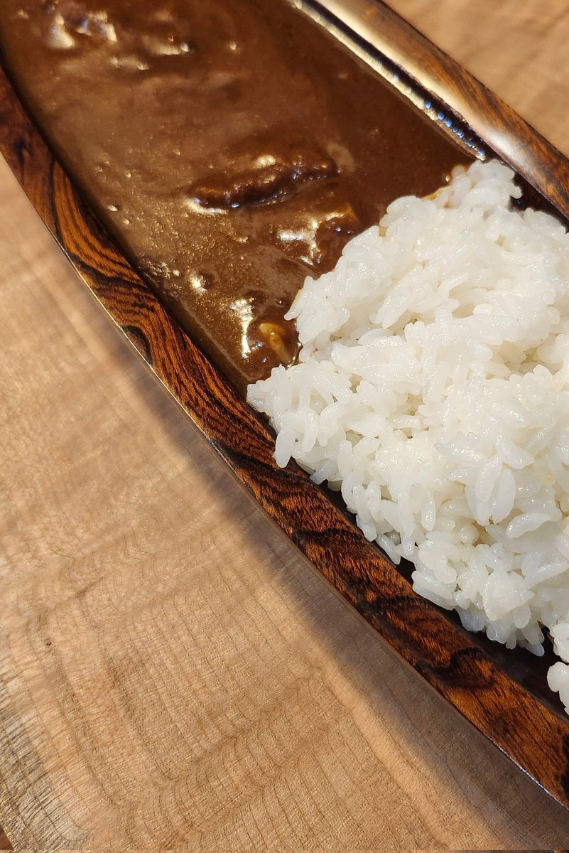 ようやく自作の欅拭き漆盛器にカレーを入れてみました。  美味しいよりも面白いが勝ちます。控えめにいって最高です。 スプーンも口当たりが抜群に良い(自画自賛) #木工 #木工芸 #拭き漆 #工芸 #伝統工芸 pic.x.com/ZpLBncyqqr