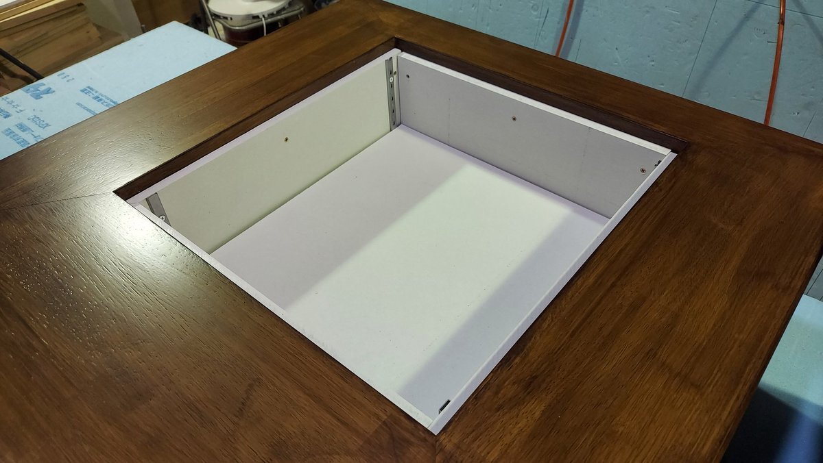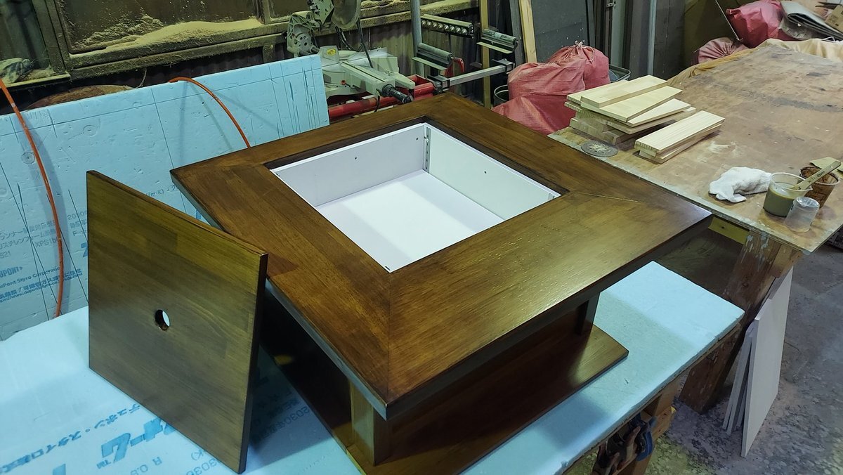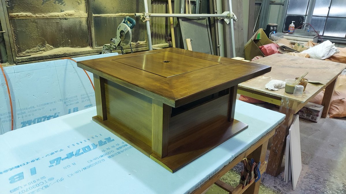 特注の囲炉裏テーブル 天板の四方の幅が違う特殊設計の囲炉裏テーブル。炉の底板は可動式で高さを変えることができ、電気コンロ、ガスコンロ、七輪など様々な熱源に対応できます。これでスルメ炙って熱燗で一杯やったら最高にいい雰囲気で晩酌ができそう。 #木工 #家具 #ハンドメイド pic.x.com/XG9ZiXY53D