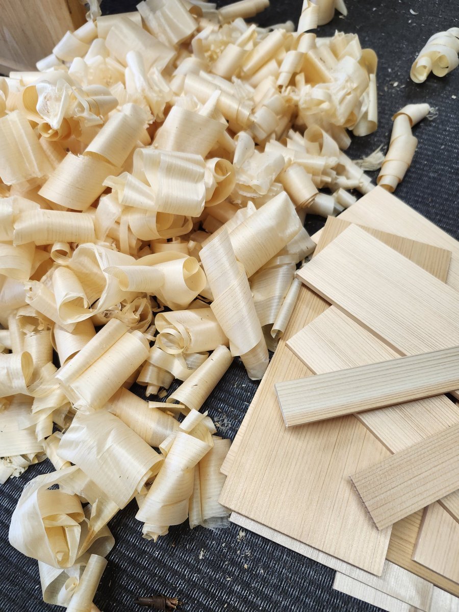 漆刷毛用のヒノキの板。 二時間ぶっ続けで鉋がけをしました。 機械で挽いたヒノキの板を7mmから3mm強に削りました。 木材よりも先に手の皮が限界を迎えました。明日は筋肉痛ですね ゴミ箱がヒノキの良い香りで包まれています。 #木工 #木工芸 pic.x.com/HkR1o0jnJj