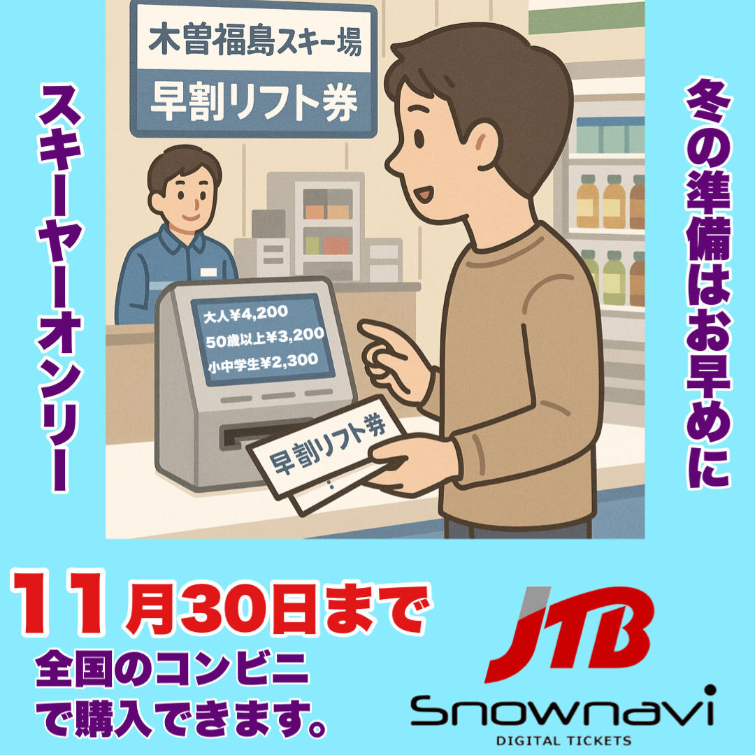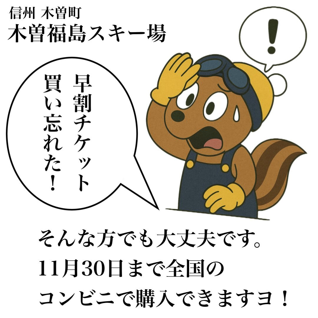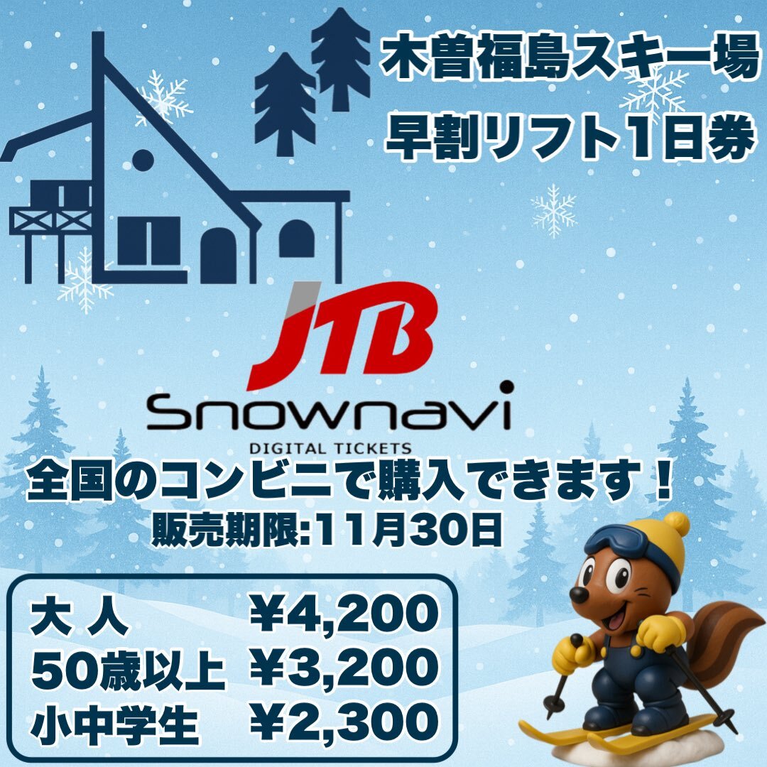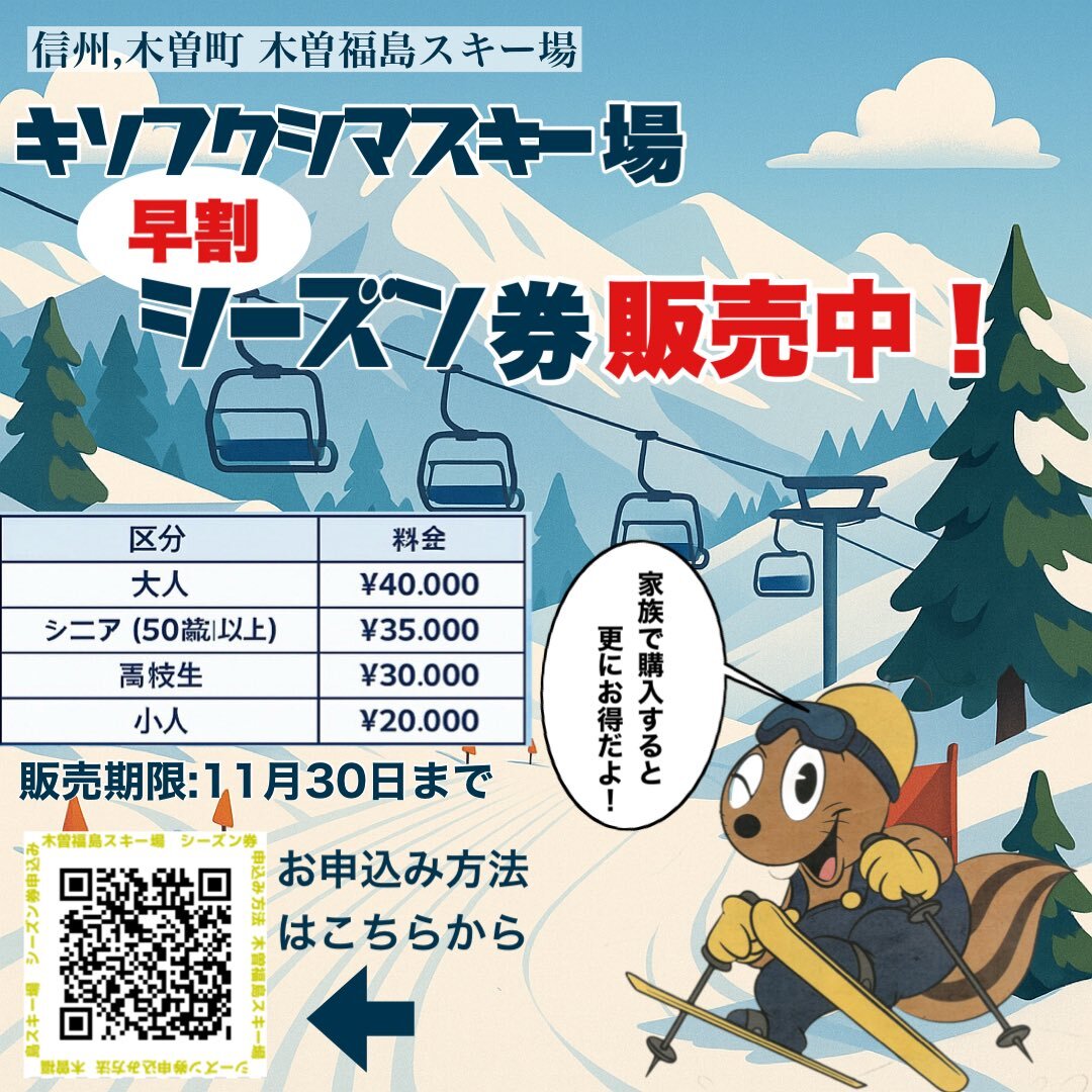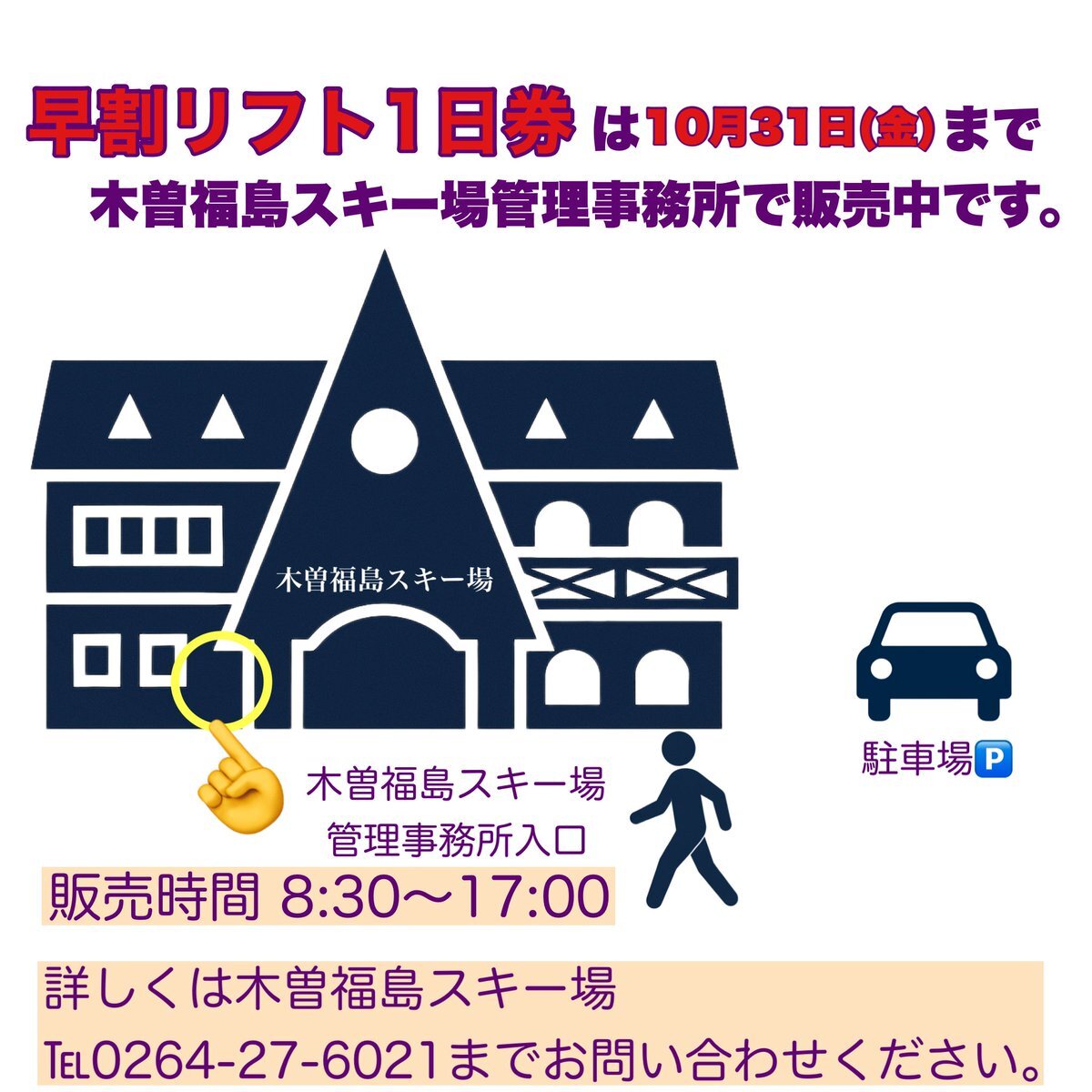 まだ間に合う!木曽福島スキー場の早割リフト券⛷️ 現地販売は10/31(金)まで🉐 #木曽福島スキー場 #木曽町 #スキーヤーオンリー pic.x.com/HNv4LeVUjh