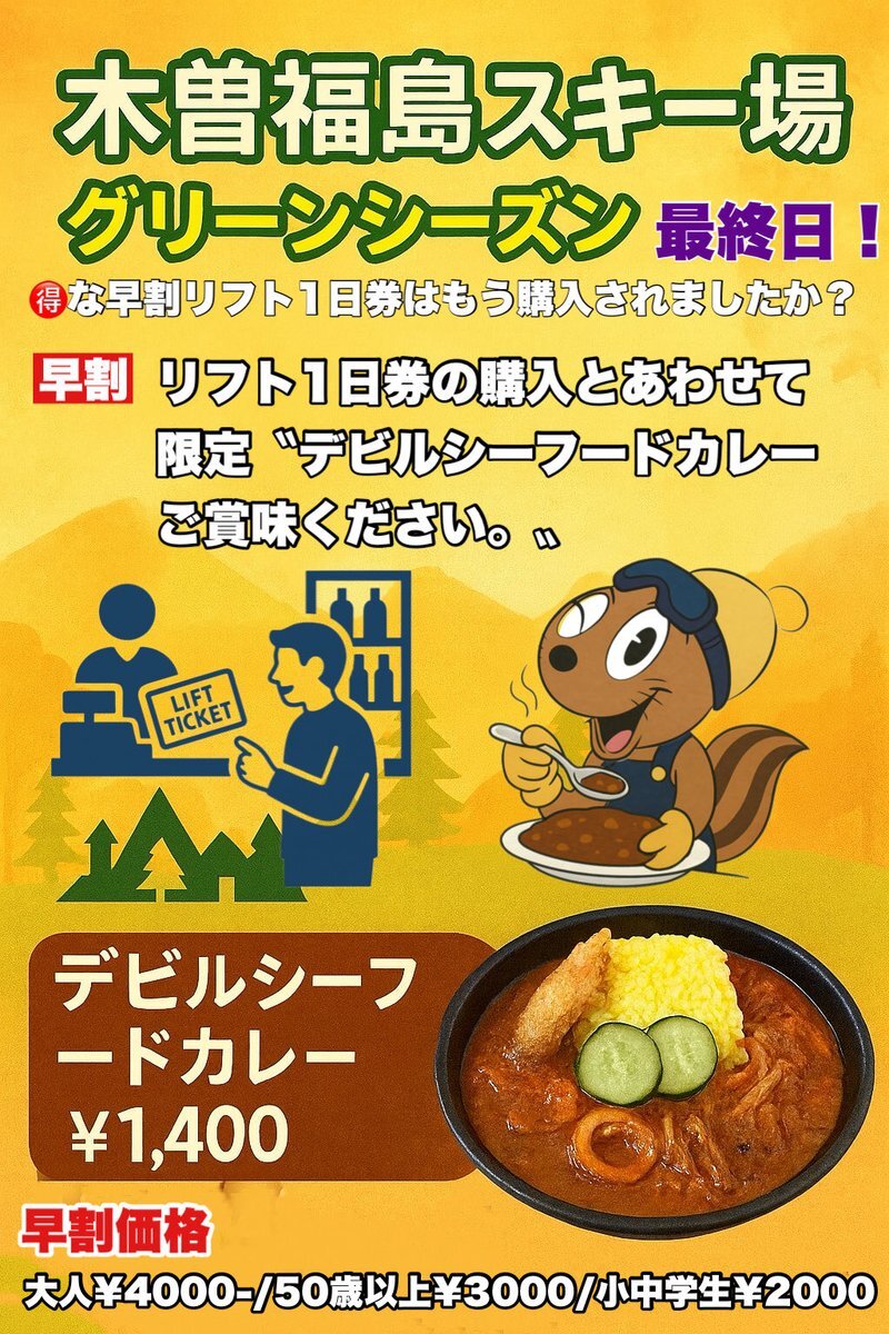 木曽福島スキー場のグリーンシーズンは残りわずか、いよいよラスト2日! 10月25日・26日には、山本支配人特製〈デビルシーフードカレー〉を販売します🍛 🉐早割リフト1日券のご購入とあわせて、ぜひお立ち寄りください。 #木曽町 #木曽福島スキー場 #早割リフト1日券 #スキー専用ゲレンデ pic.x.com/DFoTKf1Y8y