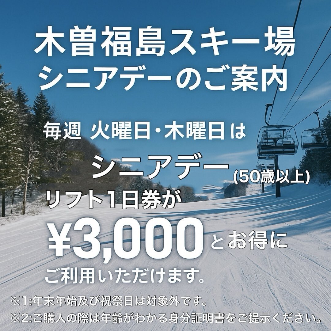 50歳以上の方に朗報です! 木曽福島スキー場では、 毎週 火曜・木曜は “シニアデー”! ⛷️リフト1日券が 3,000円 と大変お得にご利用いただけます。 混雑の少ない平日に、ゆったり滑りませんか? #木曽福島スキー場 #シニアデー #50歳以上お得 #毎週火曜日木曜日 #スキーヤーオンリー pic.x.com/WeNaT62iee