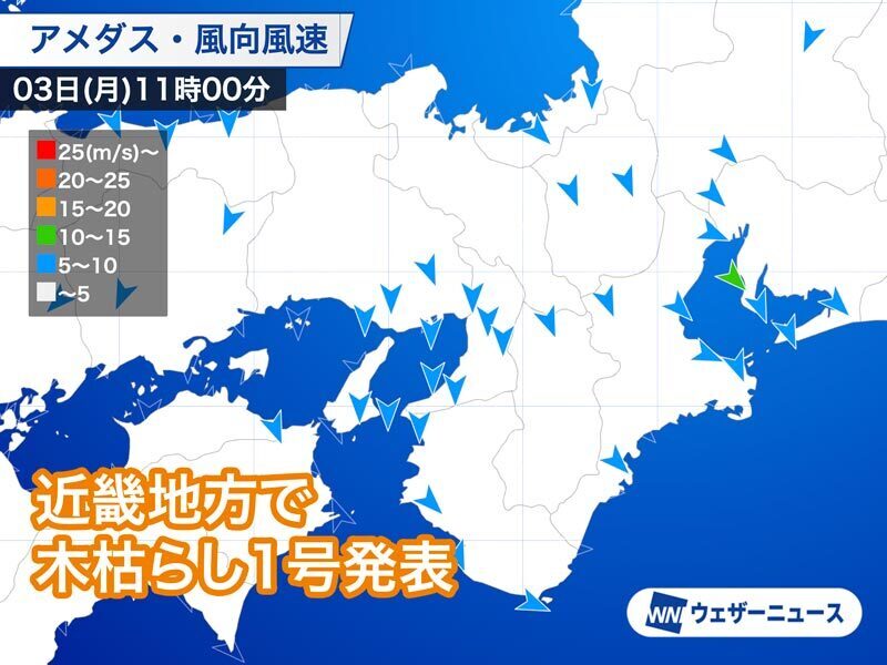 <近畿で「木枯らし1号」> 今日3日(月)文化の日の日本付近は、一時的に西高東低・冬型の気圧配置となっています。 近畿では北寄りの風が強まり、大阪管区気象台は本日、木枯らし1号が吹いたと発表しました。昨年より4日早い発表です。 weathernews.jp/news/202511/03…