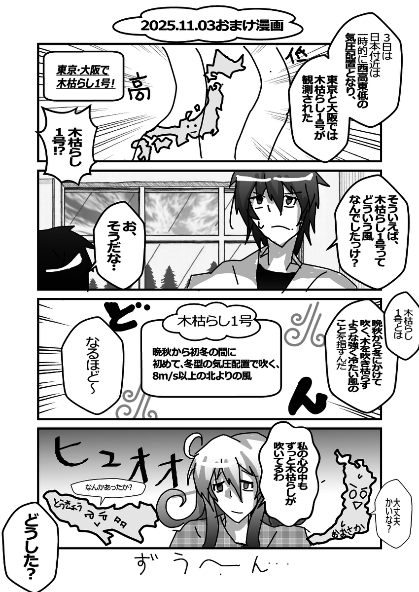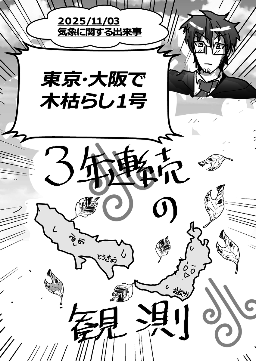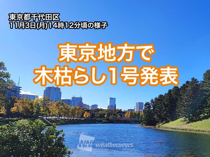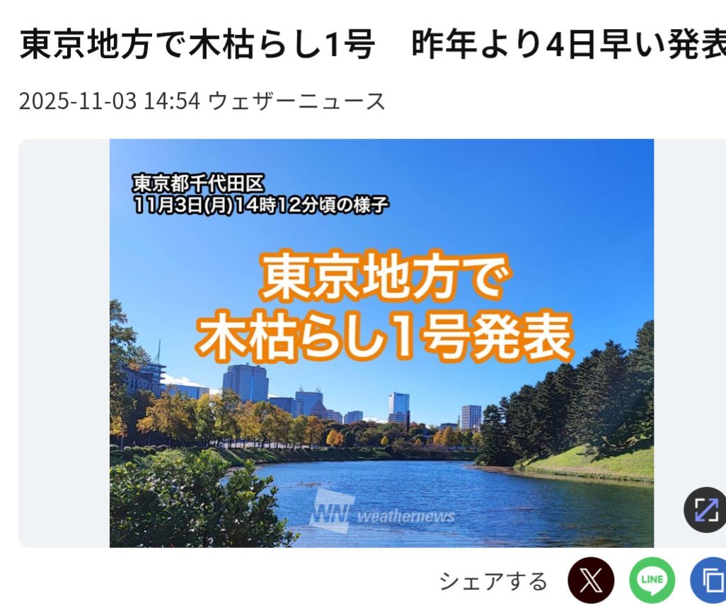 <東京で「木枯らし1号」> 気象庁は東京地方で木枯らし1号が吹いたと発表しました。 関東南部では段々と風が強まり、東京都心では午後になって「木枯らし1号」の発表基準を満たす8m/s以上の最大風速を観測しました。昨年に比べて4日早い発表です。 weathernews.jp/news/202511/03…