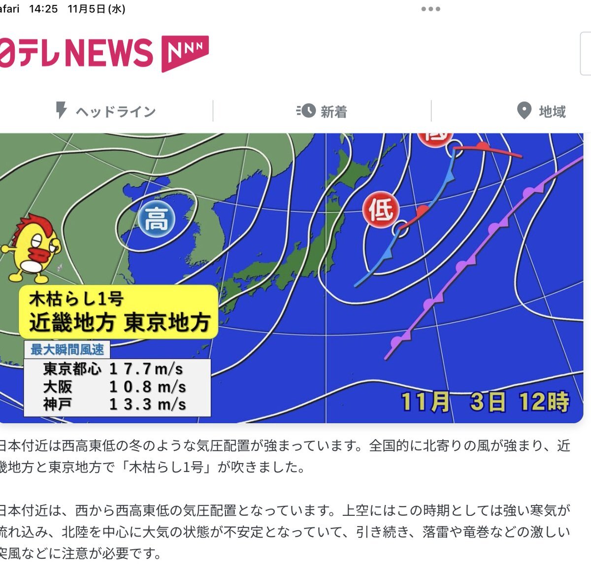 【11月3日 近畿地方で #木枯らし1号 が吹きました!】 昨年(11月7日)より4日早い発表でした。 木枯らしは、晩秋から初冬にかけて吹く北よりの(やや強い)風のことです。 次第に寒さを感じる日が多くなってきましたね🍃 体調管理に気をつけましょう。 ■神戸地方気象台HP ▶️jma-net.go.jp/osaka/topics/R…