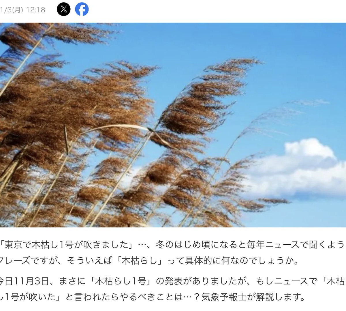 11月3日の文化の日に「#木枯らし1号」が吹いたと気象庁が発表。昨年より4日早い冬の便りに、SNSでは「いよいよ冬かぁ」「紅葉も益々進む」と季節の変化を実感する声や、防寒対策、冬の楽しみについて語る投稿が相次いでいます。 #木枯らし #冬の訪れ emogram.sankei.com/49607