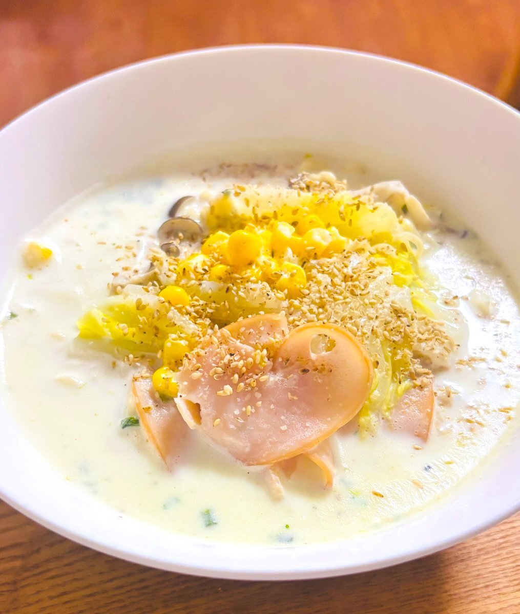 サッポロ一番塩ラーメンで ミルク塩らーめん鍋🍲 いつかミルク系アレンジをしてみたいと思ってました🥛 〝水の半量を牛乳にするだけ〟という簡単さ 具は白菜、ハム、しめじ、冷凍コーンで美味しかった〜😋 オミトさん、ありがとうございました😊 #木梨の会。#サッポロ一番 #福井さんありがとう pic.x.com/hMq5ZbPnAI x.com/kinashinokai/s…