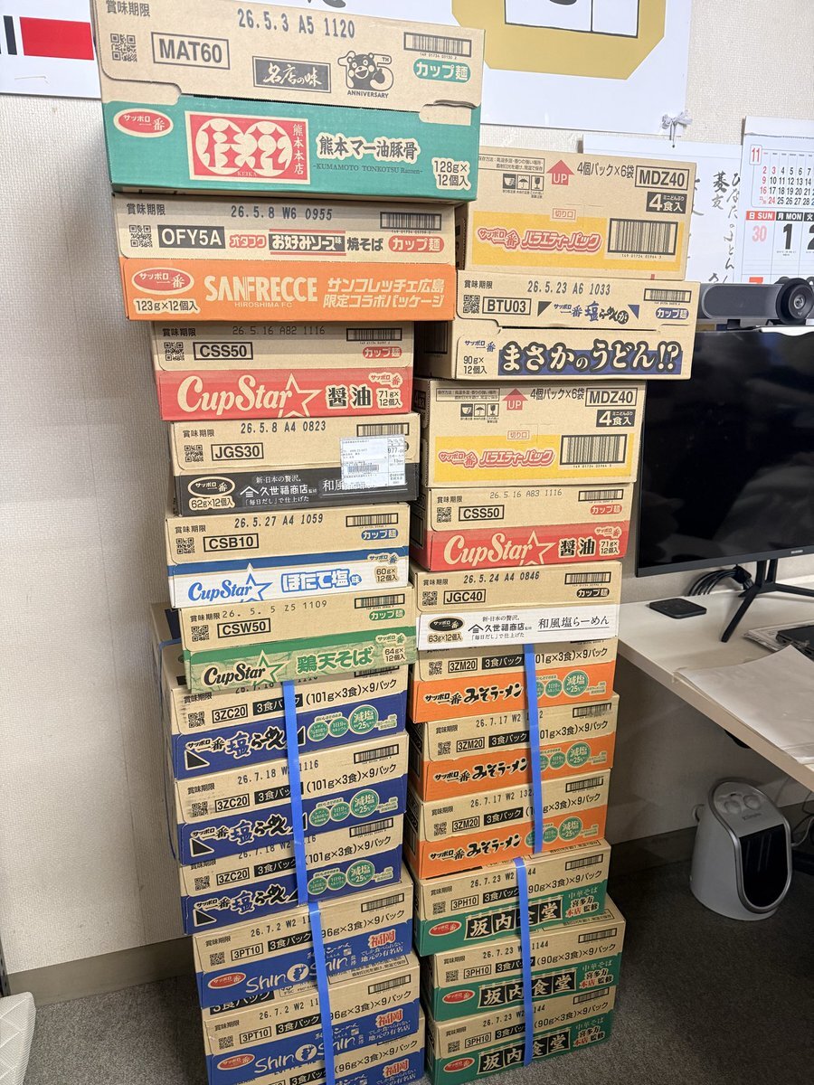 「菱友にも送っといて!」 の、のりさんの一声が、本当に届きました😂 しかも段ボールで23ケース📦 のりさん、サンヨー食品さん 福井さん ありがとうございます🙏✨ 社員一同ありがたくいただきます! #木梨の会 #サッポロ一番 #福井さん #感謝 @kinashinokai @sapporo1ban_jp