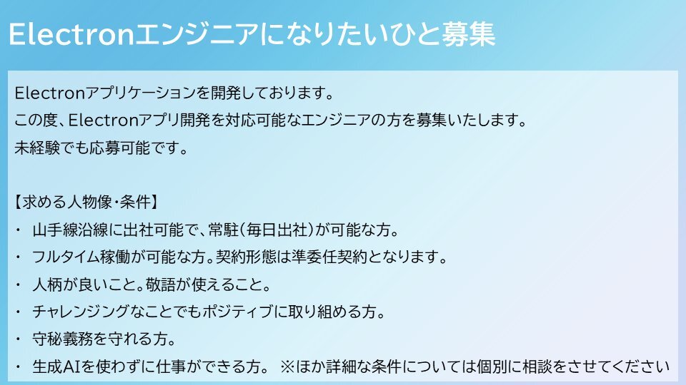 アプリ開発プロジェクトにおいて Electronアプリ開発を対応いただける方を募集します! DMよりご連絡ください #未経験歓迎 #Electron #ニートから脱却 #脱ニート #未経験からエンジニア pic.x.com/l2VKlifYn9