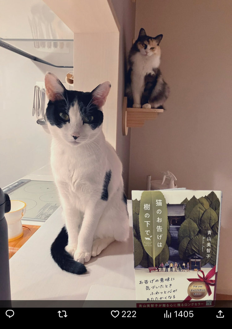 猫のお告げは樹の下で #読了 #青山美智子 #本と猫 とても清々しい気持ちになれる七つの物語✨ タラヨウの葉っぱの「お告げ」で人々を導くミクジ🐈‍⬛が神々しくもとても可愛い☺️ 人を選ばず誰もが優しい気持ちになれる そんな一冊です。 我が家のミクジはお告げではなく笑いと癒しを届けてくれます✨ pic.x.com/vw4FEiVPo8