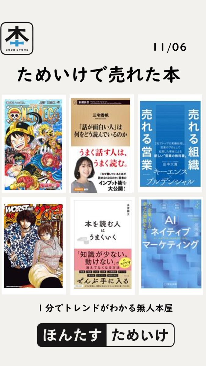 無人本屋 #ほんたす 11月9日🙂 🧑‍🚒「119番の日」🚒 秋の消防訓練🧯の時期ですね~ 📖では昨日売れた本の紹介📖 #ONE PIECE 113巻 #「話が面白い人」は何をどう読んでいるのか #売れる組織 売れる営業 #WORST外伝グリコ 35 #本を読む人はうまくいく #AIネイティブマーケティング pic.x.com/mFlOJnlnQ0