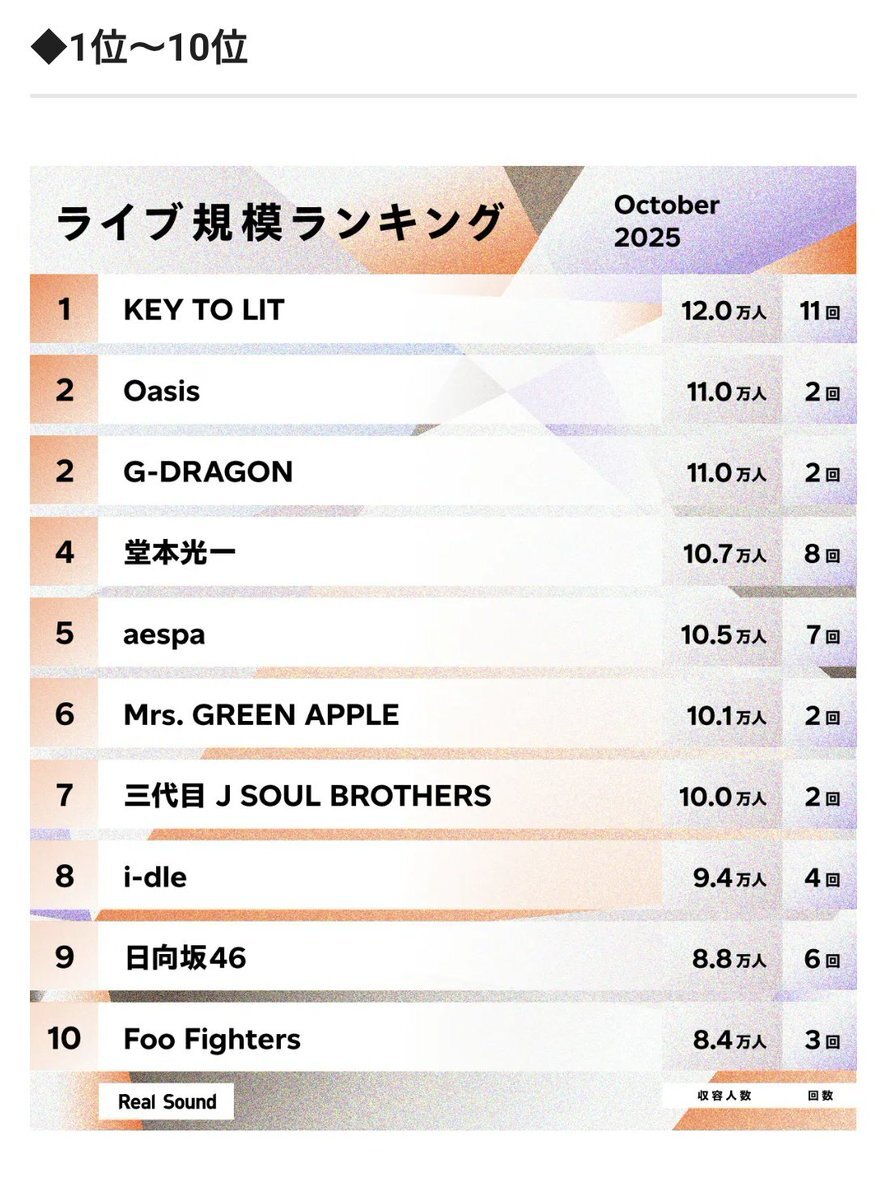 ライブ規模ランキングTOP30 (2025年10月) ❖━━━━━━━━━━━━━━━━━━❖ 👑上位ランクイン👑 ・KEY TO LIT ・Oasis ・G-DRAGON ・堂本光一 ・aespa / 30位までの順位はこちらから! realsound.jp/2025/11/post-2… \ #ライブ規模ランキング