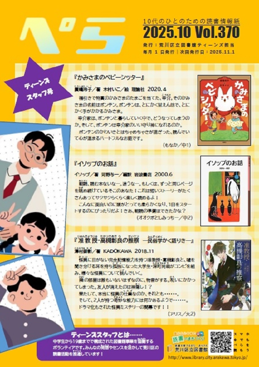 #荒川区 の #図書館 では #中高生 にオススメの本を月イチで紹介する「ぺら」を発行しています♪今月はこちらの3冊! 『かみさまのベビーシッター』『イソップのお話』『准教授・高槻彰良の推察 ―民俗学かく語りき―』 #ティーンズ #本好きさんと繋がりたい #おすすめ本 #読書 pic.x.com/6utNWtNNlN