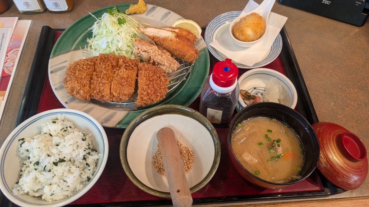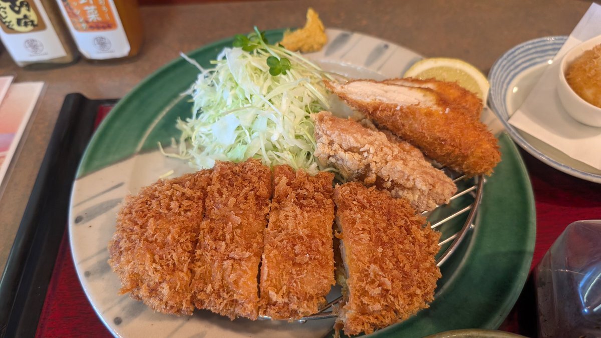 #本日の飯テロ活動 #本日のうま竹チャレンジ #かつ波奈 #かつ波奈みつわ台店 #千葉市若葉区 #うまタッチャン #うまともちゃん #うま竹 ぜいたく鶏づくしランチ (ハーフチキンカツ唐揚げささみカツ) 半熟卵かつ ご飯わかめご飯 とん汁 🤭 pic.x.com/EOyfLK2vhu