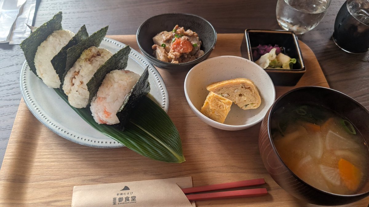#本日の飯テロ活動 #新橋観音米 #参食堂  #千葉県富里市新橋 #極みおむすび #富里市を応援し隊盛り上げ隊 #うまタッチャン #うまともちゃん #うま竹 富里ちゃんねる が 来るまで まずは 一品目 味比べ新橋おむすび定食 (お好きなおむすび小さめ×3.小鉢2.汁物) 😃 pic.x.com/bOazJYumRI