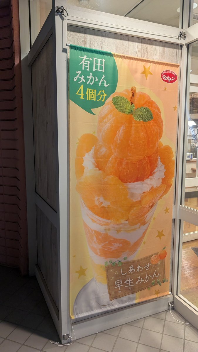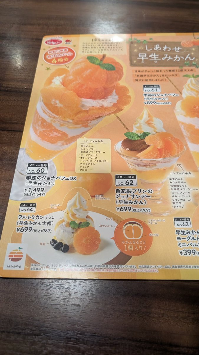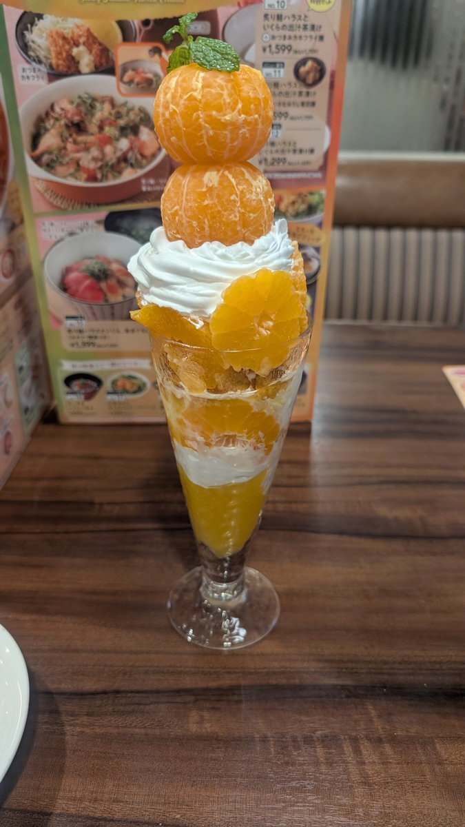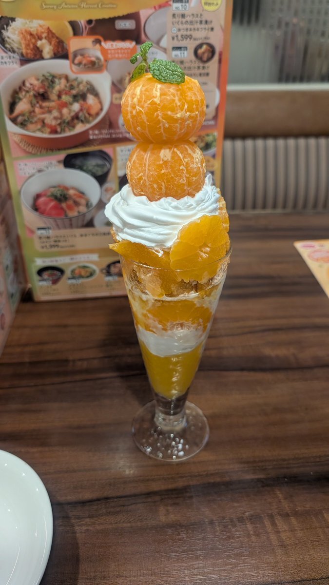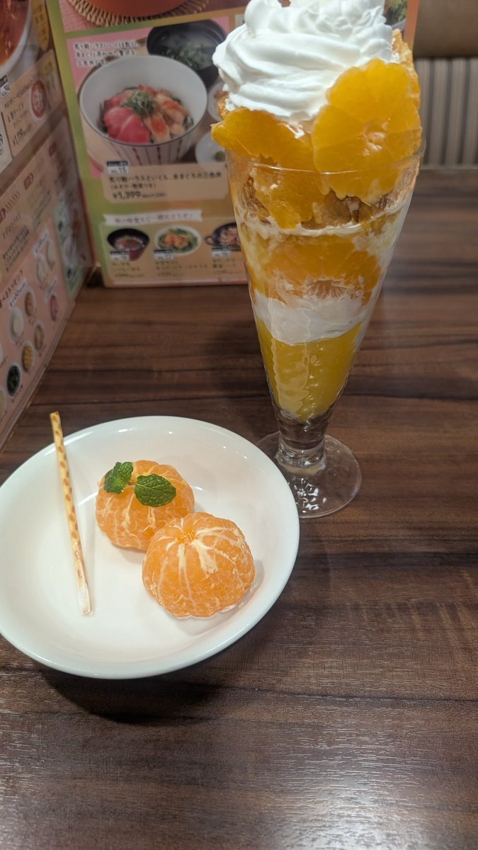 #本日の飯テロ活動 #本日のうま竹チャレンジ #ジョナサン行徳新浜店 #〆パフェ #千葉県市川市 #うまタッチャン #うまともちゃん #うま竹 さあ、来ました 本日の本命 季節の ジョナパフェ DX (早生みかん) 🍊和歌山県産有田みかん🍊 四個分使用!🍊 pic.x.com/NnHzEY3zPA