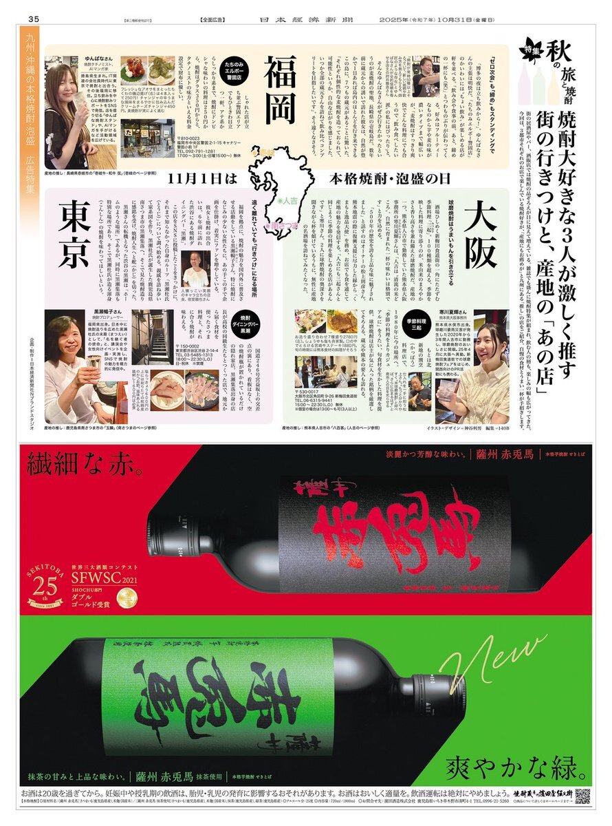 10/31掲載「九州・沖縄の本格焼酎・泡盛」特集 明日11/1は「#本格焼酎・泡盛の日」。 東京・大阪・福岡の3都市それぞれのお店から、焼酎好きが産地・九州にある「推し」の店を紹介。 7ページにわたり、焼酎の魅力を掘り下げています。 #日経 #新聞広告 pic.x.com/bf5Ulw9KmI