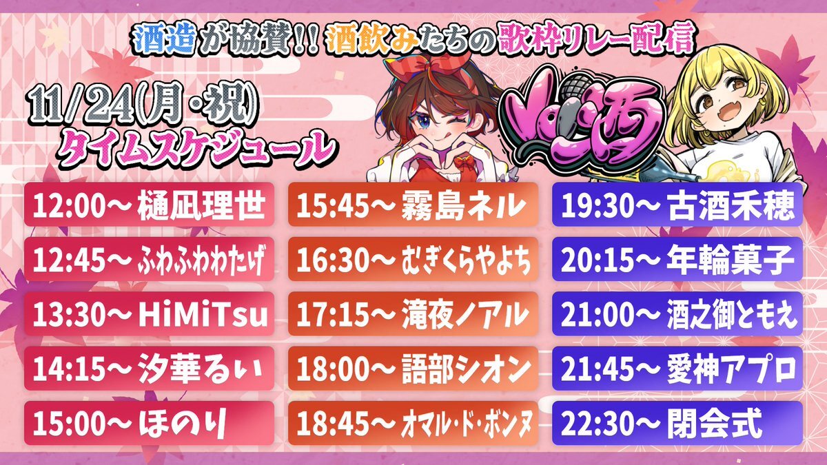 #Voi酒 タイムスケジュール決定🎉 1人45分の歌&雑談&PRリレー配信✨️ 11時間のロング飲酒イベントだよ🍻🎙️ x.com/Eibi_hatsumi/s…
