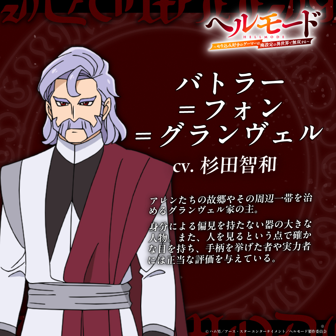 ◤#ヘルモード 🎮 キャラクター紹介◢ □━━━━━━━━‥・ 📜バトラー:cv.#杉田智和 アレンたちの故郷やその周辺一帯を治めるグランヴェル家の主。身分による偏見を持たない器の大きな人物。 💬紹介文全文& キャストコメントはコチラ hellmode-anime.com/#anchor-chara pic.x.com/PEige8RxiA